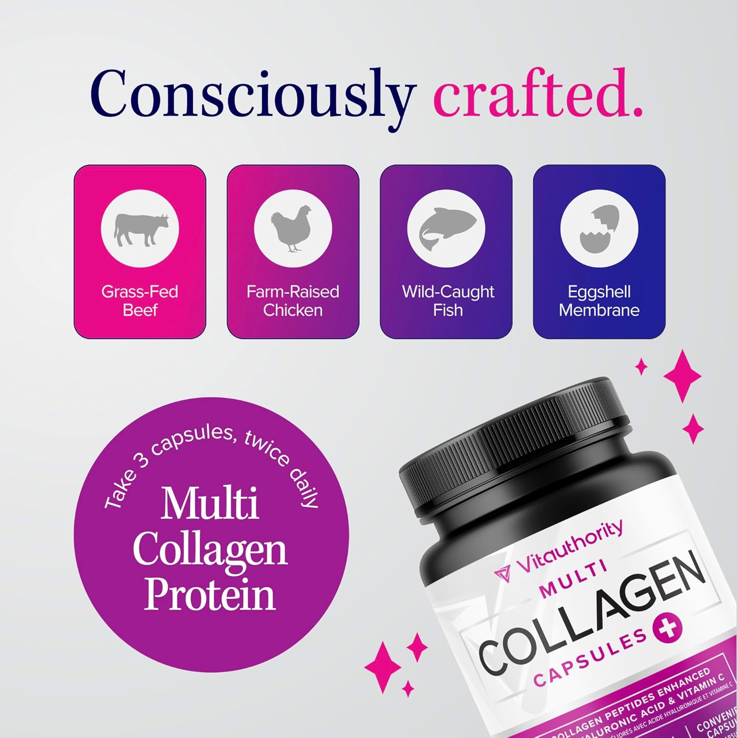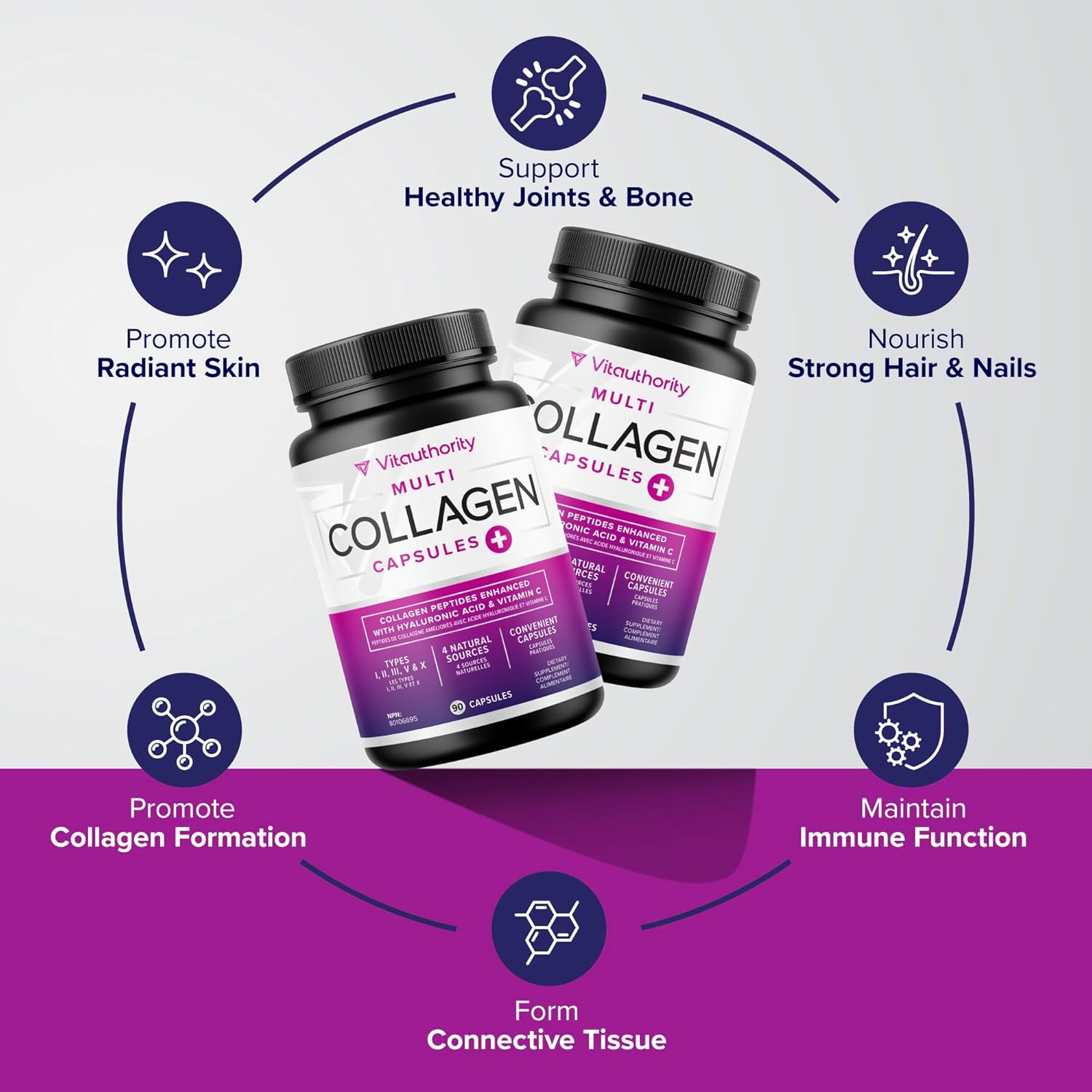 5 Types of Collagen; Each serving contains Types I, II, III, V and X Collagen plus Hyaluronic Acid & Vitamin C. Free of any Gluten, Soy, Dairy or GMO’s.