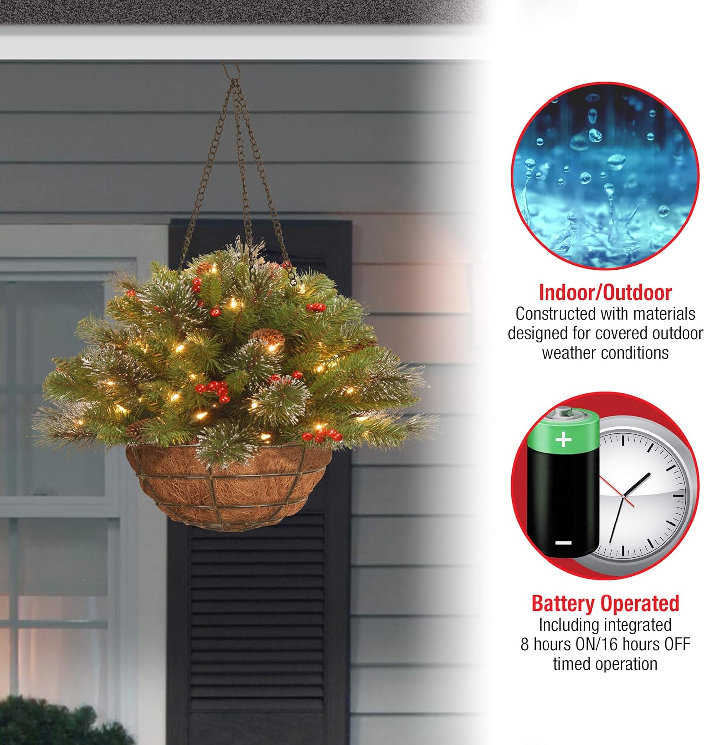 Transform your home for the winter holidays with National Tree Company’s Pre-Lit Artificial Christmas Hanging Basket Decoration. Designed with a Crestwood Spruce branch base, this hanging basket is 16 inches wide and decorated with pine cones, berry clusters and frosted branches. These beautifully ornate decorations complement the basket’s natural looking branches. Hundreds of crush-resistant polyethylene tips form full bodied branches to create a hanging basket with remarkable realism. This fantastically festive hanging basket decoration is strung with white LED lights prior to packaging for a more convenient setup. The lights operate individually, so if the bulb lens has not been cracked or broken, the light set will continue to illuminate except for any individual bulbs that are not working. To power the lights, simply place three AA batteries into the battery pack and let the pre strung lights illuminate your home with the warmth and cheer of the holiday season. Hang this decorative basket over any door, window or mantle to bring a Christmas ambience into any room or covered porch. Constructed with sturdy, high quality materials and hypo-allergenic, fire-resistant needles, this basket is built to bring holiday cheer for years to come. This hanging decoration is suitable for both indoor and covered outdoor use. At National Tree Company, we strive to create high quality Christmas decorations to help you transform your home so you can keep making every holiday moment magical.