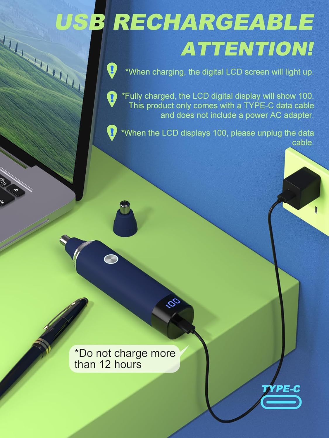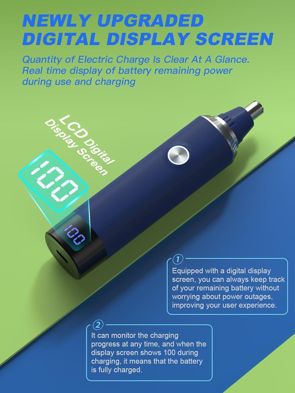 【Newly Upgraded Digital Display Screen】:The newly upgraded nose hair trimmers for men , equipped with an LCD digital display screen, allows you to track remaining battery power at any time, without worrying about power outages, improving the user experience.
