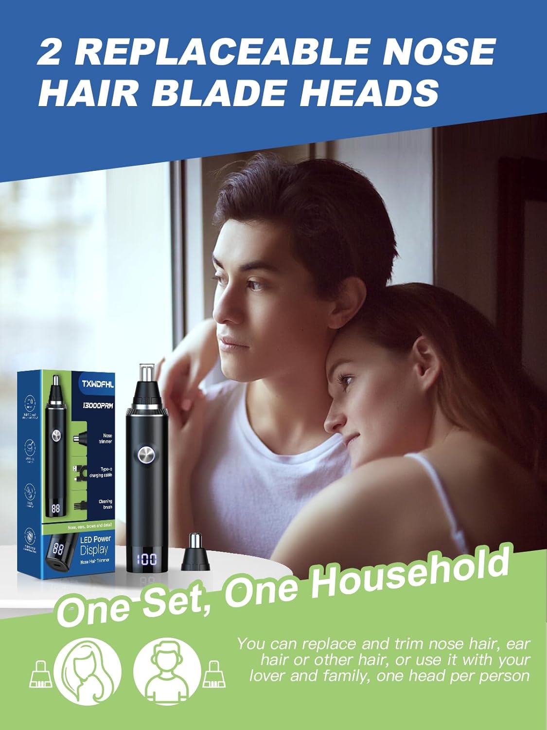 【2 Interchangeable Heads & Multifunctional】: This nose hair trimmers for men is equipped with 2 interchangeable nose and ear hair trimming heads, allowing two people to use it, which is both hygienic and convenient. By rotating clockwise, you can easily switch heads. One for trimming nose hair, one for trimming ear hair, or you can use it with your lover.Alternatively, you can use it with your partner, using one blade for each person.One set ,one household.