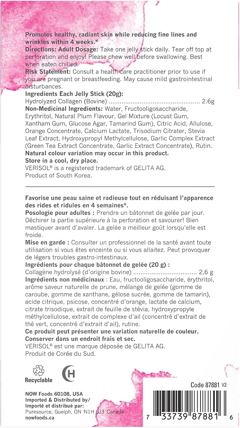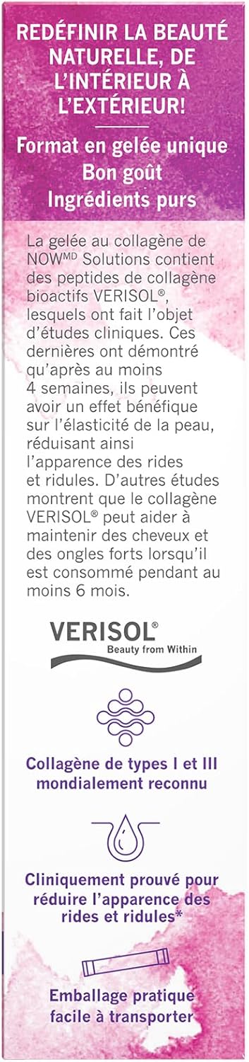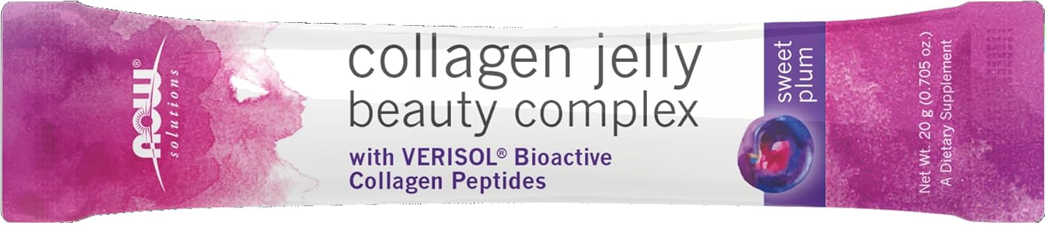 NOW® Solutions Collagen Jelly features VERISOL® Bioactive Collagen Peptides, which have clinical studies demonstrating when taken for at least 4 weeks, can positively influence skin elasticity, resulting in the reduction of fine lines and wrinkles. Other studies show VERISOL® may help maintain strong hair and nails when taken for at least 6 months. With 10 portable jelly sticks per box, this unique beauty supplement provides nutrients to support skin health from within.