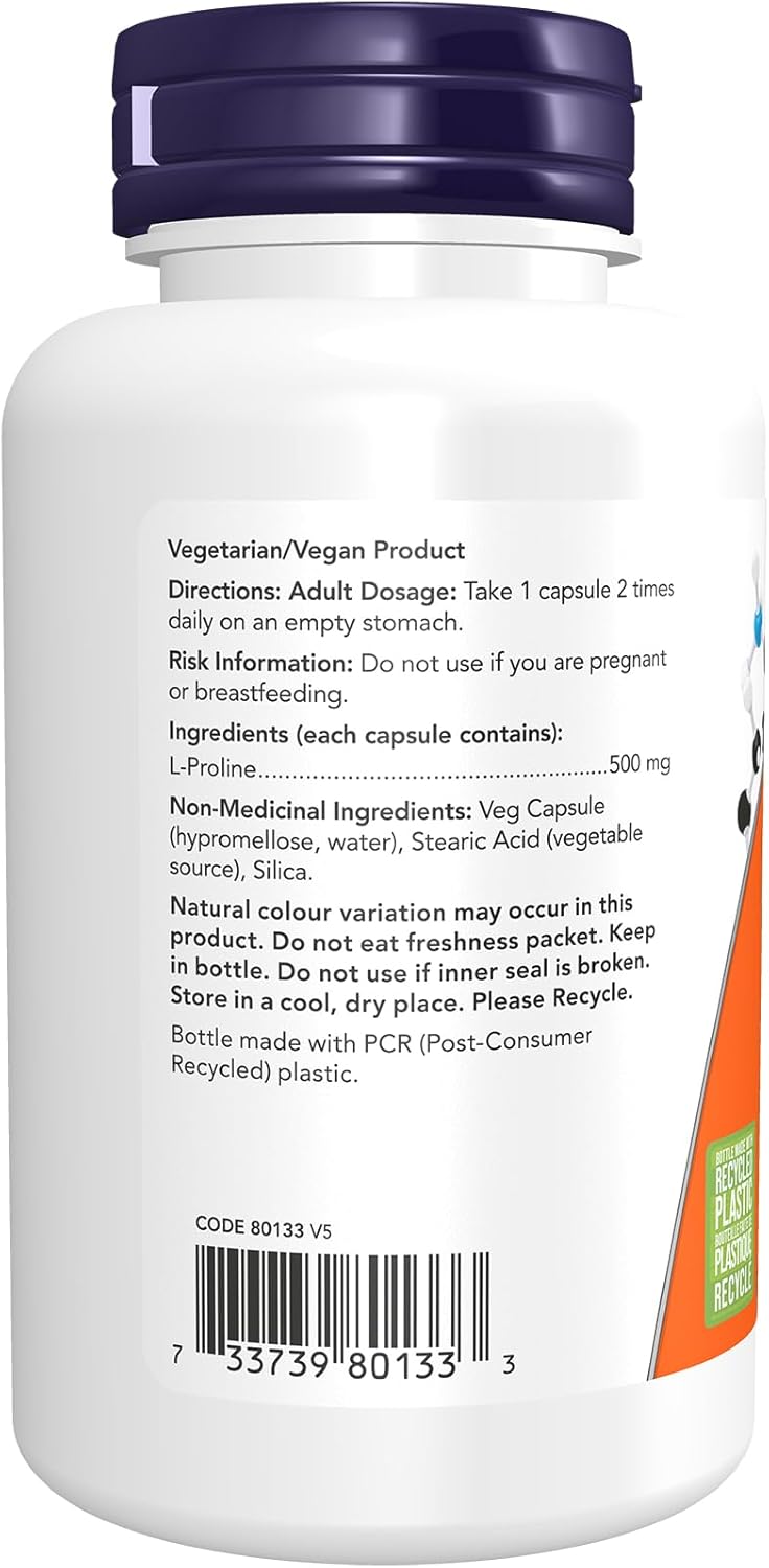 L-Proline is an amino acid that is essential for the synthesis of collagen, the most abundant protein in mammals. Collagen is the main structural protein that constitutes all human connective tissues, including skin, tendons, ligaments, joints, bone, and vasculature (veins and arteries). L-Proline therefore provides building blocks that help to stabilize and strengthen the structural components of the body. Although proline can be made in the body, low protein and vegetarian diets may not provide optimal support for the production of collagen. NOW L-Proline is 100% vegetarian. Our NOW natural and organic Supplements are an effective way to ensure you and your loved ones are getting essential vitamins, minerals and nutrients for daily optimal health. Since 2000, the NOW brand has been supporting Canadians with a mission to provide products that empower people to lead healthier lives. 70% of the NOW products in Canada are made or packaged in Guelph, Ontario, employing hundreds of Canadians from coast to coast. NOW performs 31,000 quality tests every month to ensure you get the highest quality supplements at the best price possible. Our promise – what is on the label, is precisely what is in the bottle.