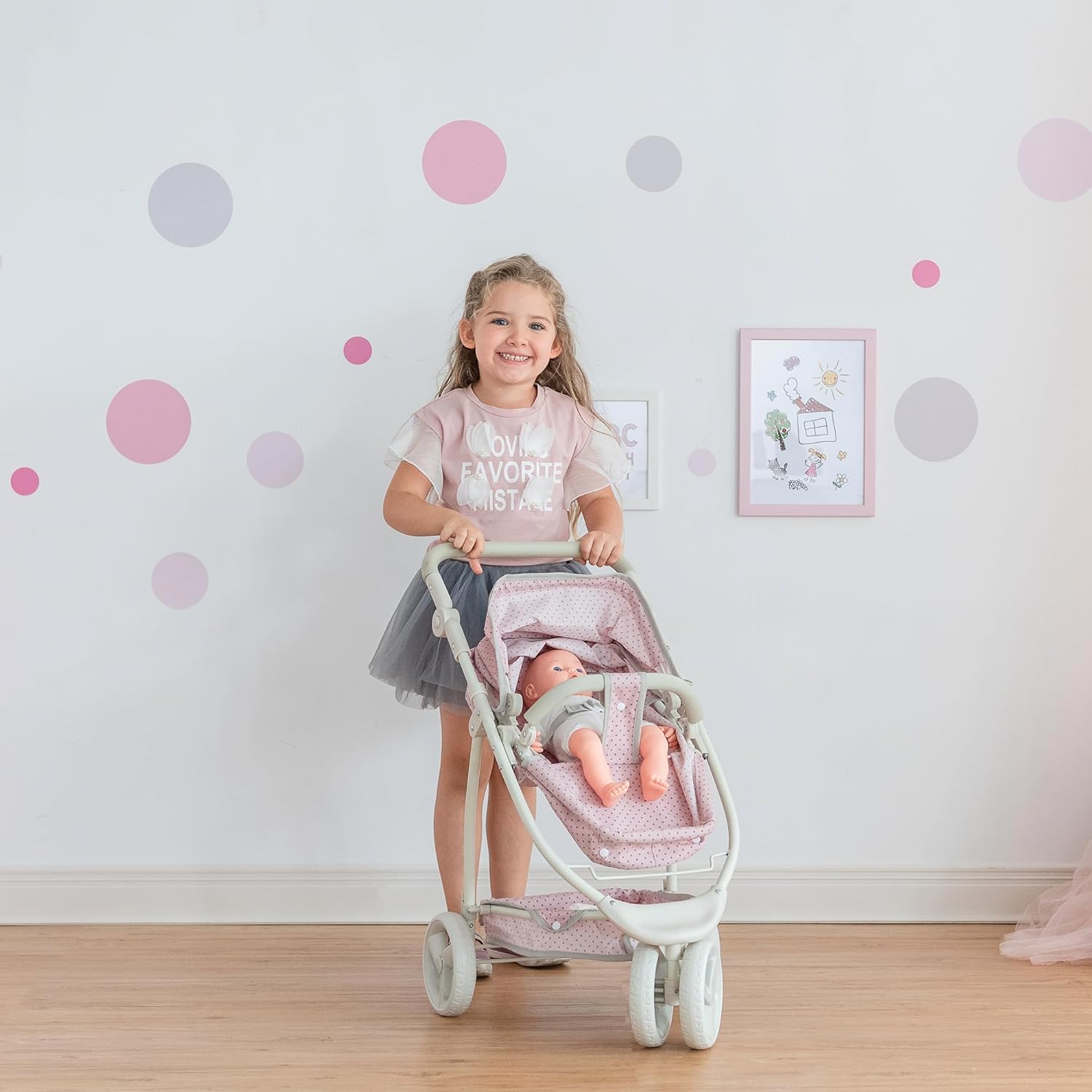 Olivia’s Little World 2-in-1 Convertible Baby Doll Stroller with Retractable Canopy, All-Terrain Wheels, and Adjustable Handle, Cream and Pink with Gray Polka Dots