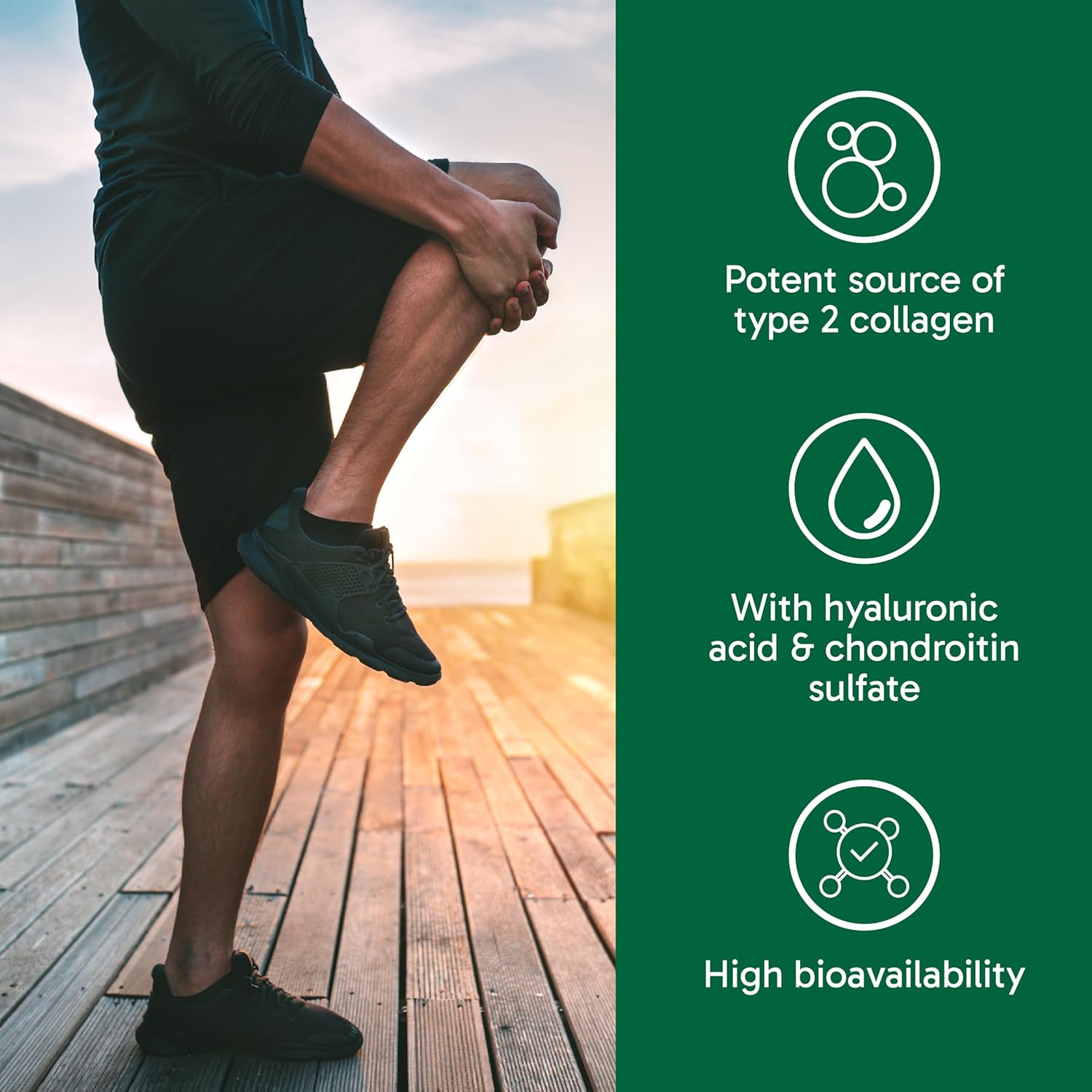 JOINT SUPPORT: Type 2 Collagen works best at building connective tissues, ligaments and cartilage, which helps support the joint structure.