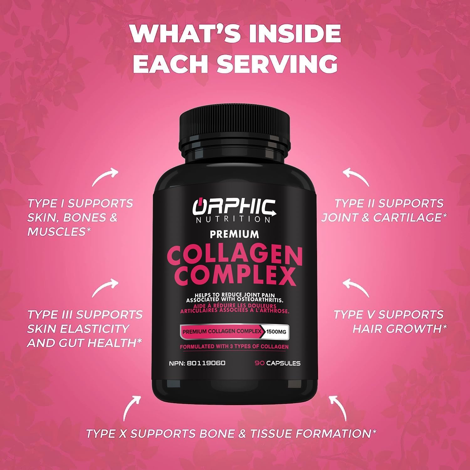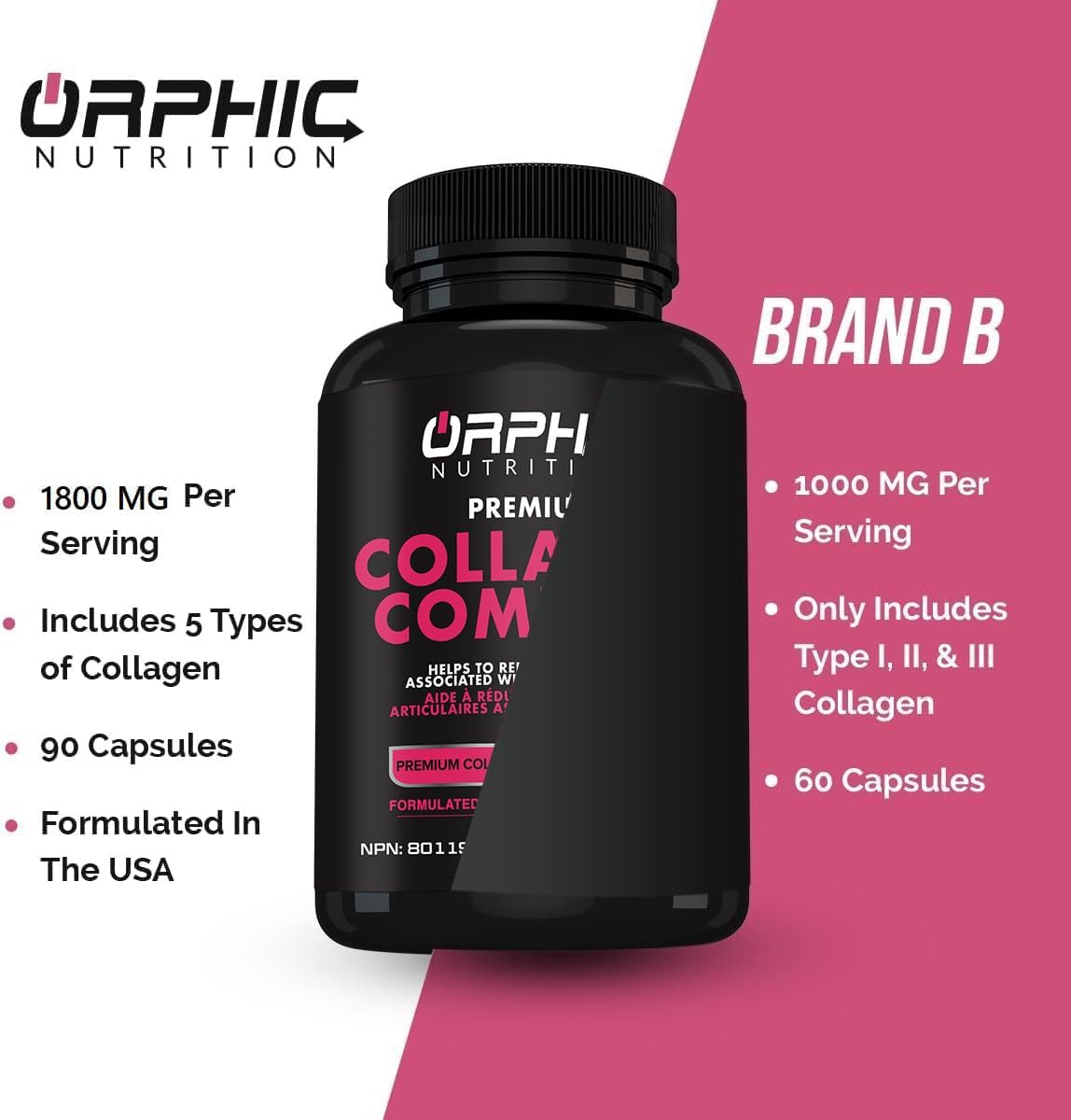 ORPHIC NUTRITION Premium Collagen Peptides Capsules 1800mg – Types I, II, III, V, X – Supports Digestive Health* – Helps Maintain Strong Joints, Tendons, Ligaments and Muscles* – 90 Caps