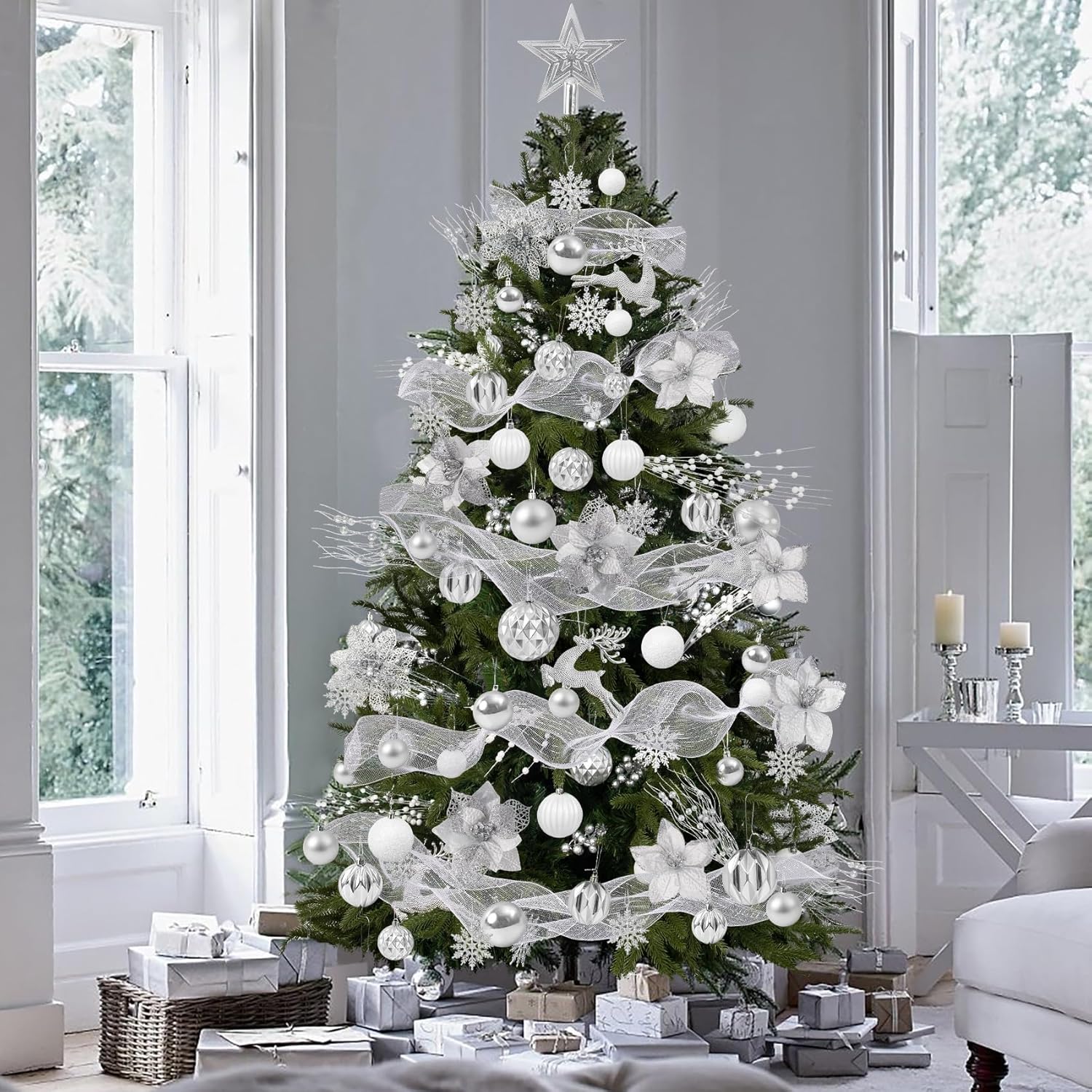 Christmas Tree Decorations Set: The silver Christmas ornaments including 105 pcs in different designs, come with Christmas balls, Christmas tree topper, glitter poinsettia flowers, artificial berry stems, snowflakes, elk ornaments, metallic mesh ribbon
