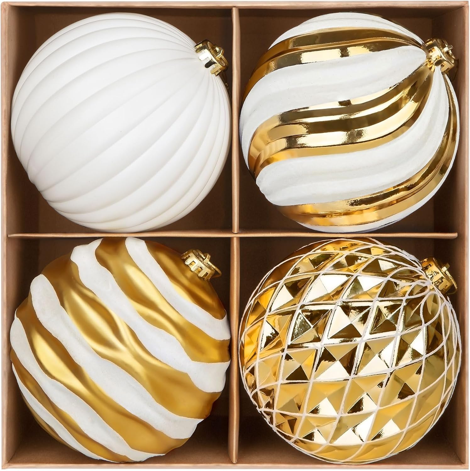 Ouddy Decor 6” Large Christmas Balls Ornaments, 4 Pcs Extra Large Gold & White Hanging Ball Shatterproof Christmas Tree Decorations for Xmas Mantle Holiday Winter Wedding Party Decor