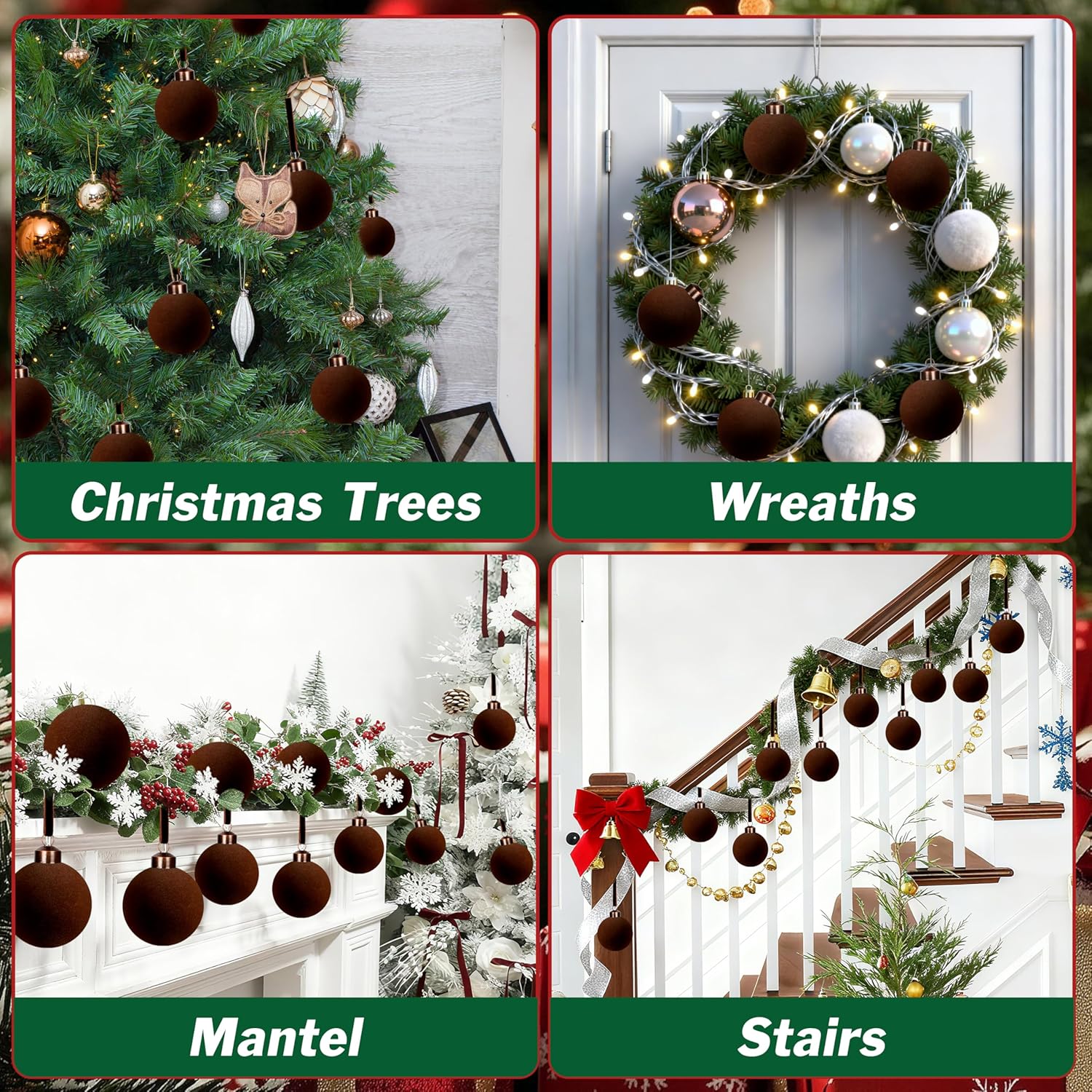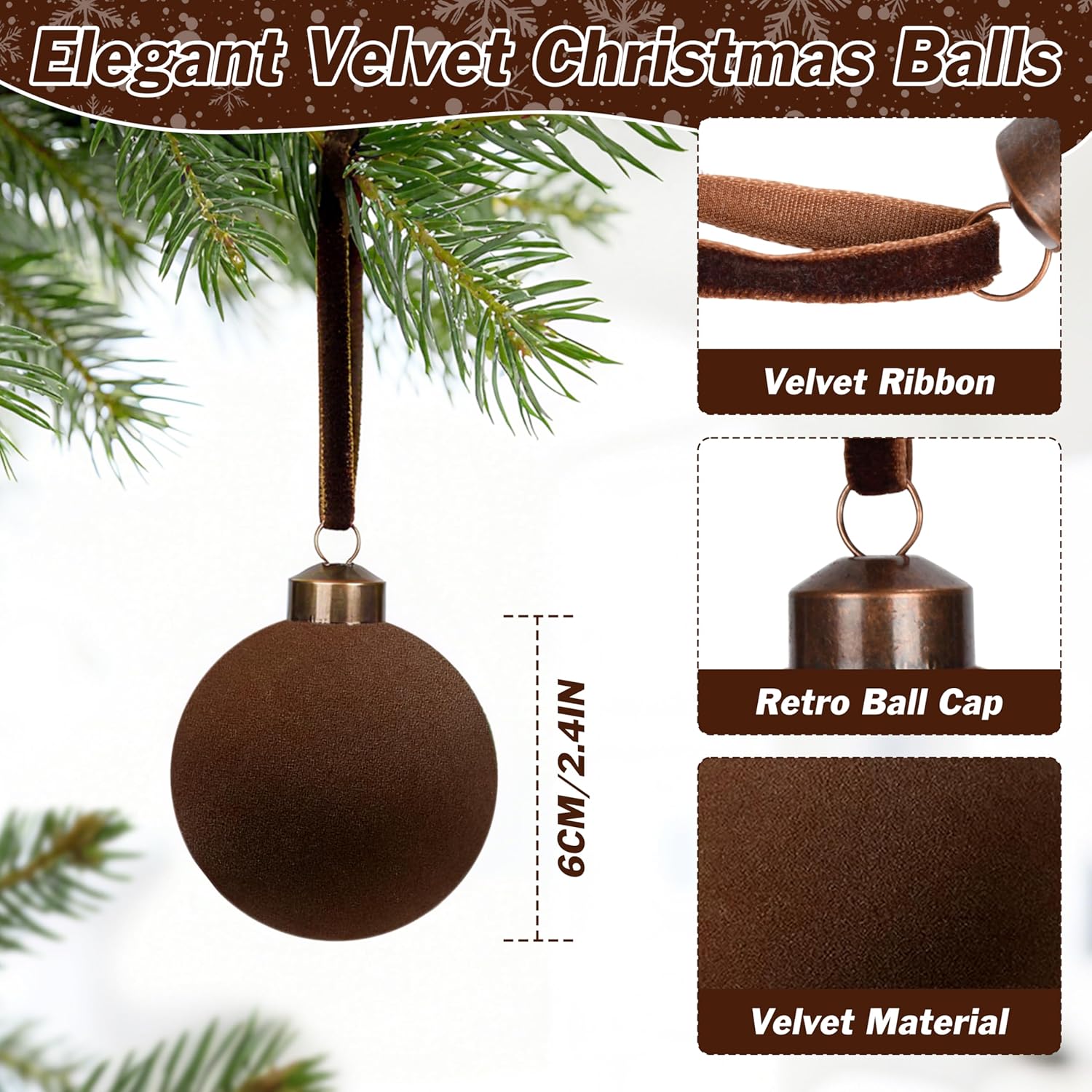 【Elegant Velvet Texture】Each ornament features a soft velvet flocked finish that creates a luxurious and sophisticated look, bringing a warm, retro charm to your holiday décor.