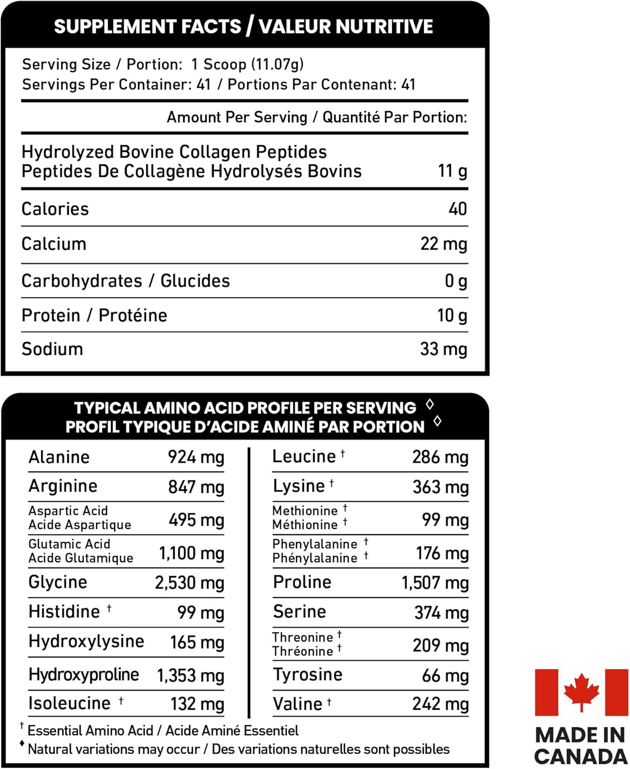 EACH SCOOP CONTAINS: 11 grams of Type 1 & 3 Collagen Peptides Powder with 10 grams of protein and 18 Amino Acids including Alanine, Arginine, Aspartic Acid, Glutamic Acid, Glycine, Histidine, Hydroxylysine, Isoleucine, Leucine, Lysine, Methionine, Phenylalanine, Proline, Serine, Threonine, Tyrosine and Valine.