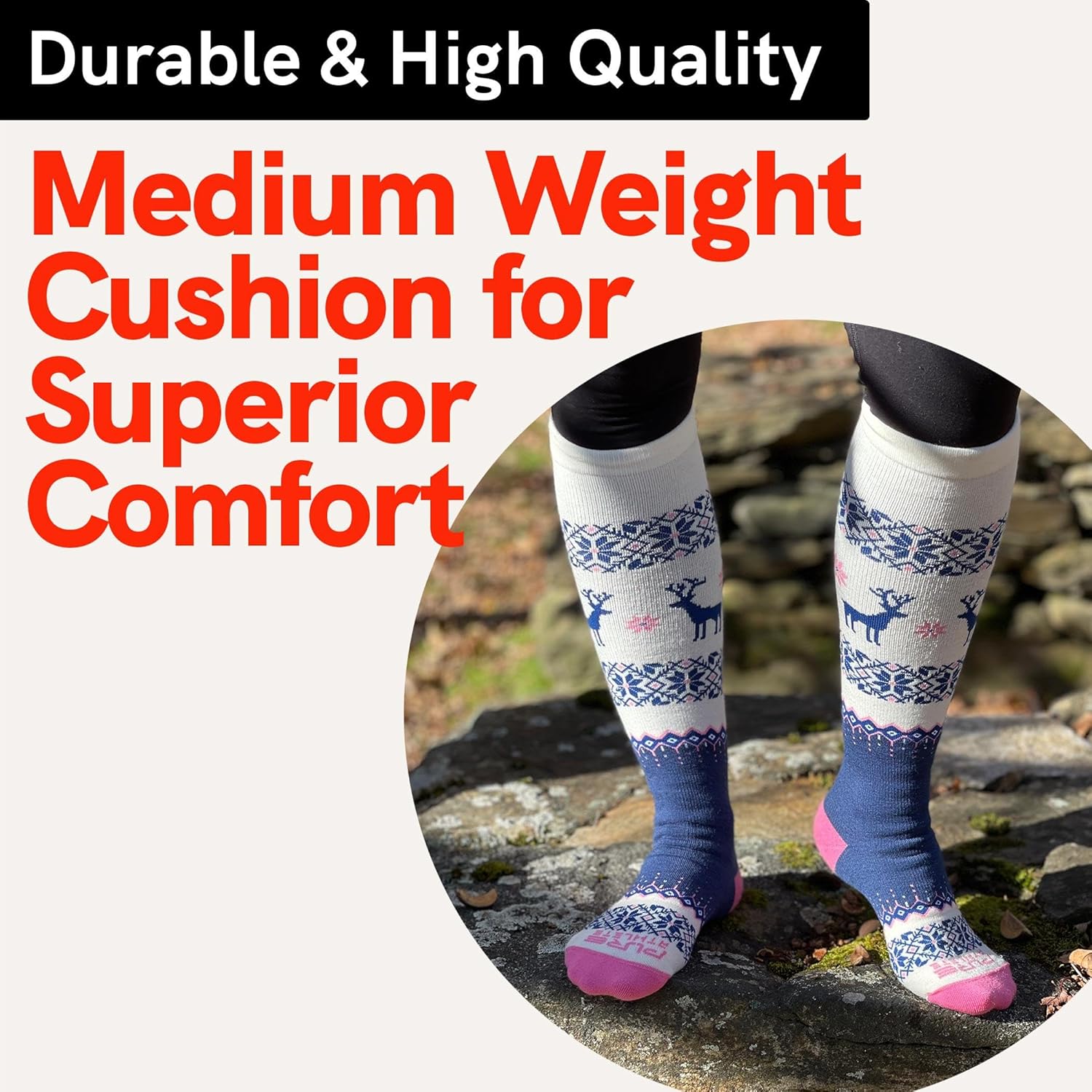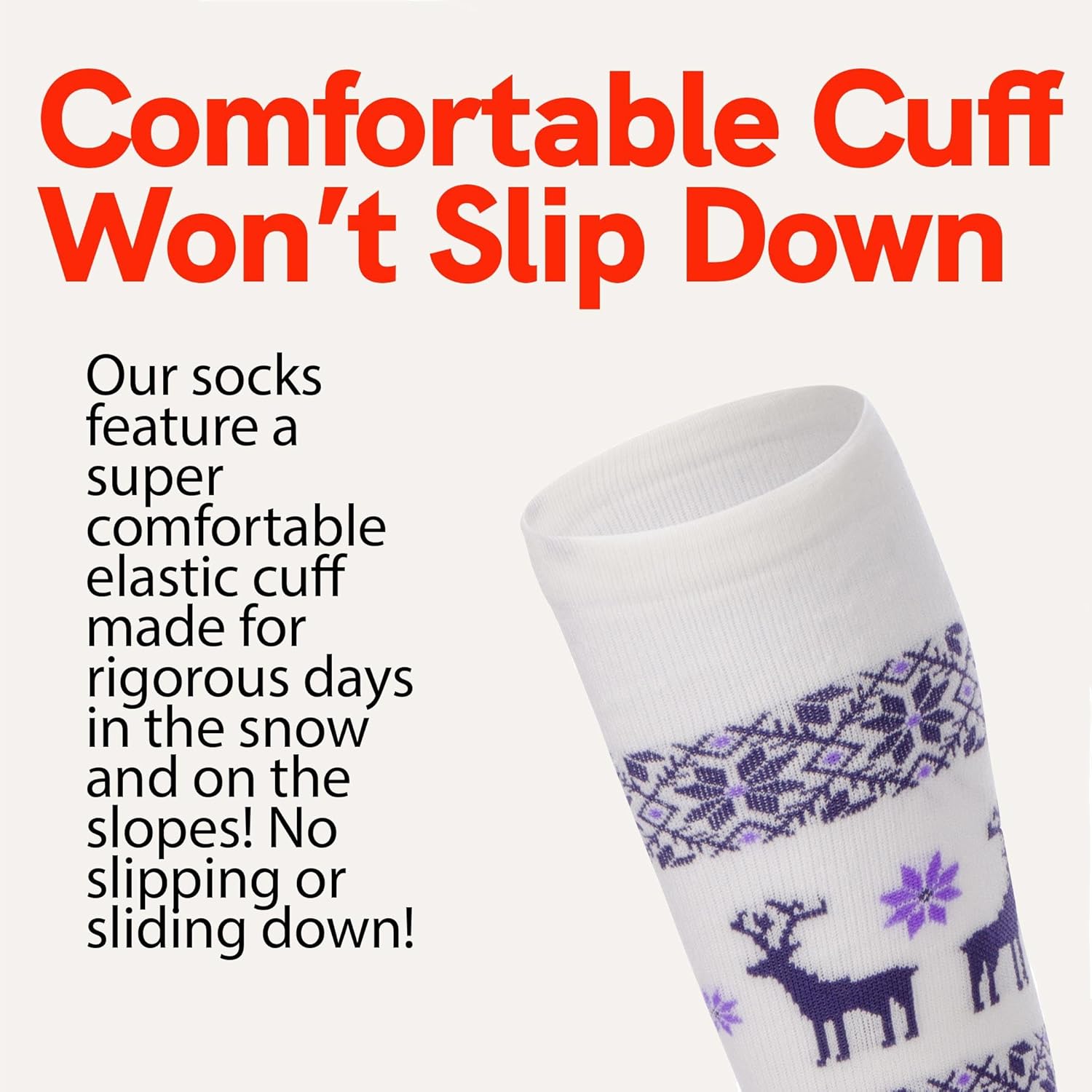 Customers find these ski socks keep feet warm and comfortable, with one noting they’re not itchy. The socks feature a fun reindeer pattern and fit well, with one customer mentioning they’re wide enough for big calves. Customers particularly appreciate their performance in negative-degree weather and their ability to stay up without slipping, while also noting they’re not too thick.