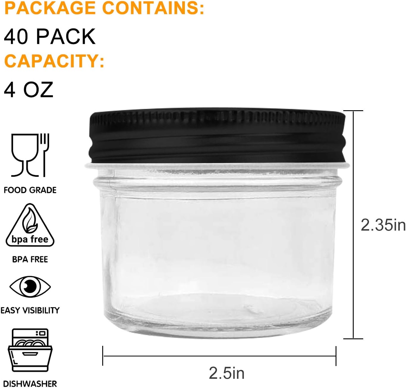 Include:40pack 4 ounce mason jar with black lids Material:BPA free & Food grade safe materiels. Classic & Elegant Wide mouth jar design. Great for food storage. Suit for many occasion Great for canning Excellent gift choice Transparent glass jars with black lids. Dishware safe,easy clean.