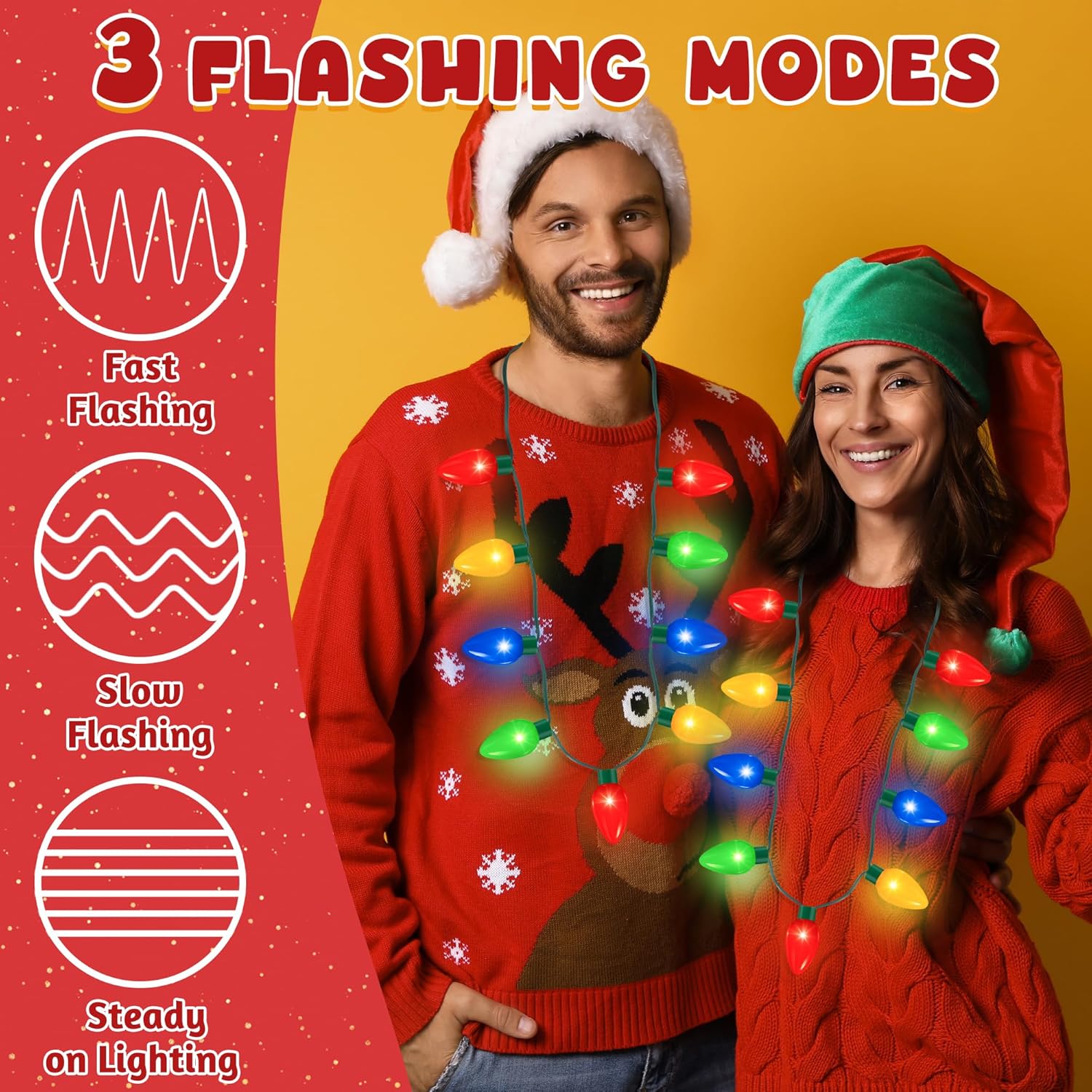 Classic Design: Our necklace includes yellow, red, blue, and green light bulbs, a colorful novelty Christmas lights, and has three adjustable lighting modes: fast flash, slow flash, and constant light. Add more unforgettable memories to your Christmas