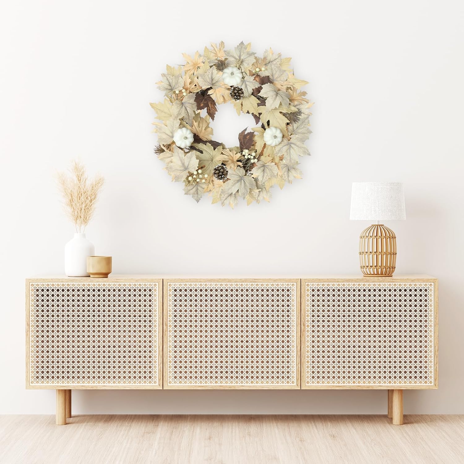【Rich Autumn Details】Crafted with beige, light brown maple leaves, this autumn wreath is accented with white pumpkins, pine cones, and berries. The mix of textures and neutral tones creates a cozy harvest look that complements farmhouse, rustic, or modern fall decor
