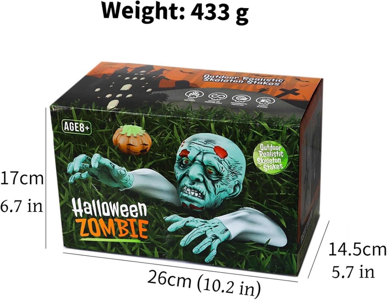 Halloween Yard Decoration: Realistic zombie garden stake, product includes 1 zombie skull, 2 zombie arms with white sleeves and 3 plastic stakes. Create a graveyard scene, perfect Halloween yard decoration.