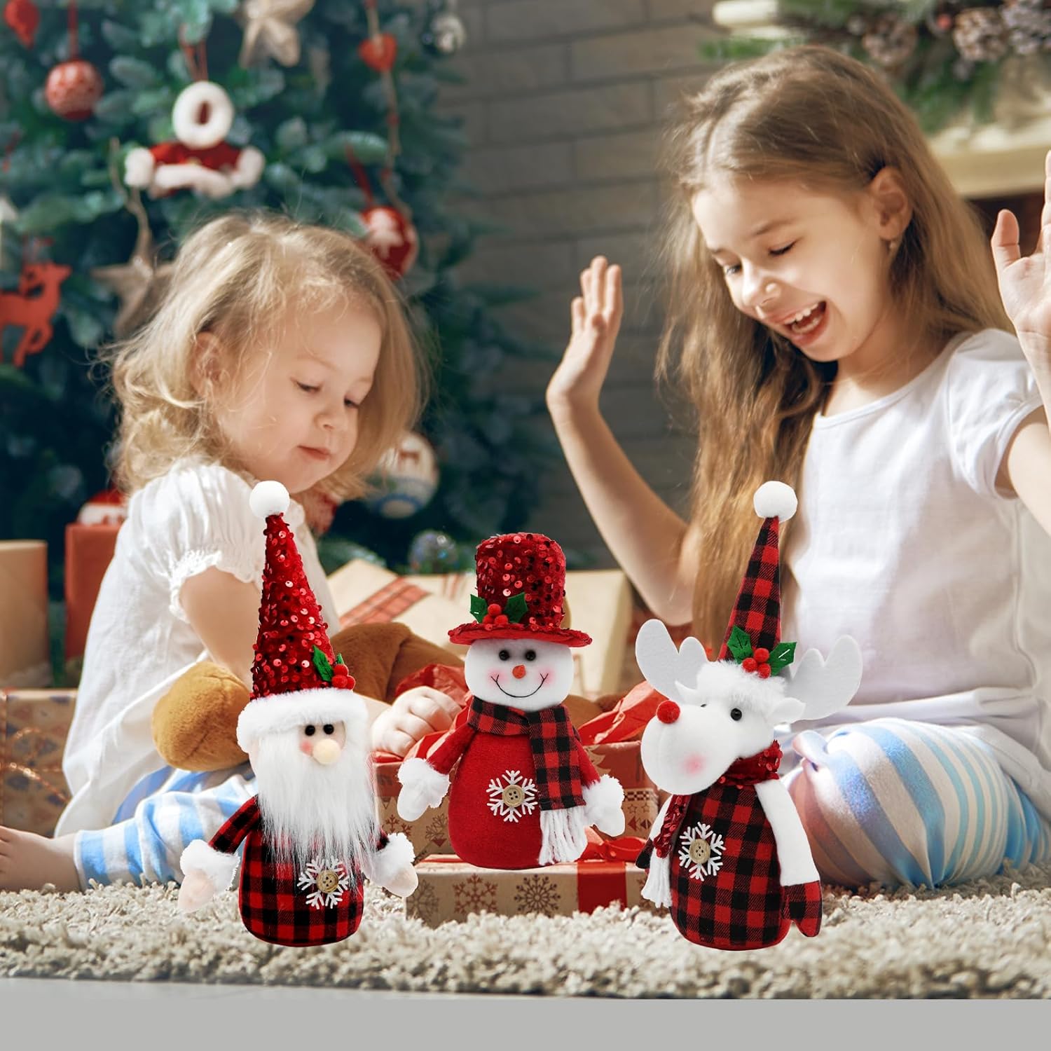Red Buffalo Plaid Christmas Decorations Indoor- 3 Pcs Red Christmas Snowman & Santa & Reindeer Plush Tabletop Tiered Tray Decor Winter Gifts