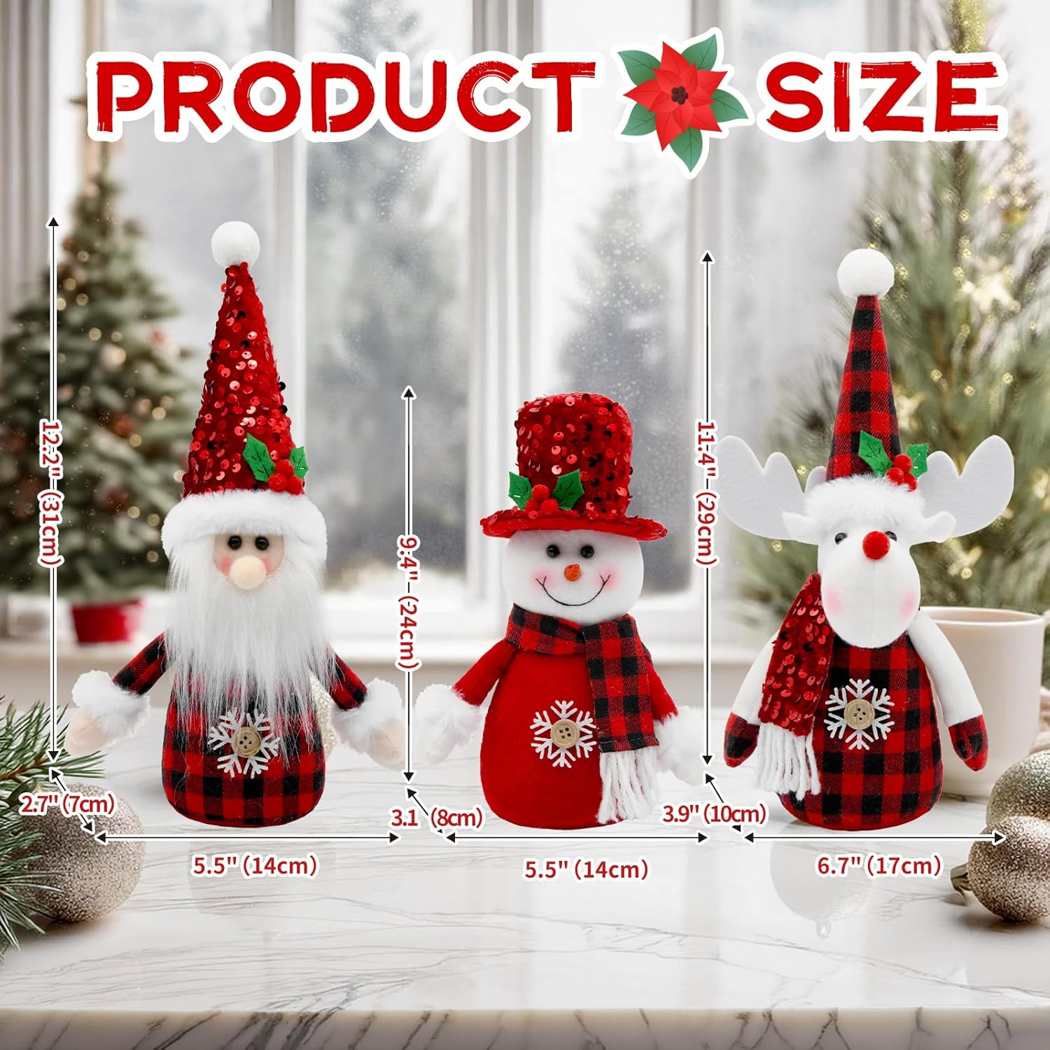 【​​✨ Christmas Decor Plush】For Christmas Displays​​ three premium plush figures.Christmas snowman decor with red sparkle hat/white beard, carrot nose and checkered scarfwinter snowman decor, reindeer christmas decor with glitter scarf, designed for ​​Christmas home decorations​​.