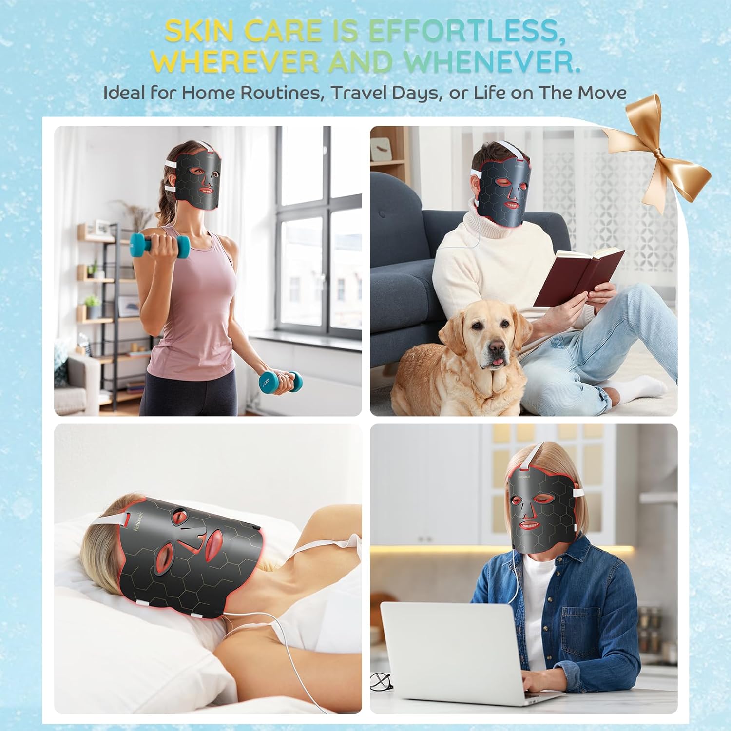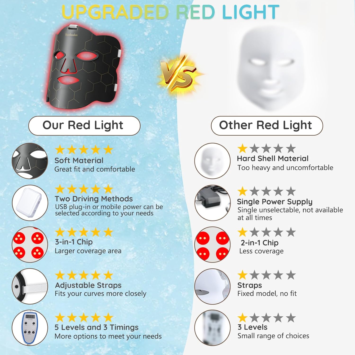 HUMANIZED DESIGN: The red light for face is made of soft, safe, and durable material, replacing the old-fashioned hard-shell masks, with adjustable straps to fit all face shapes, while the eye pads protect the eyes without causing discomfort