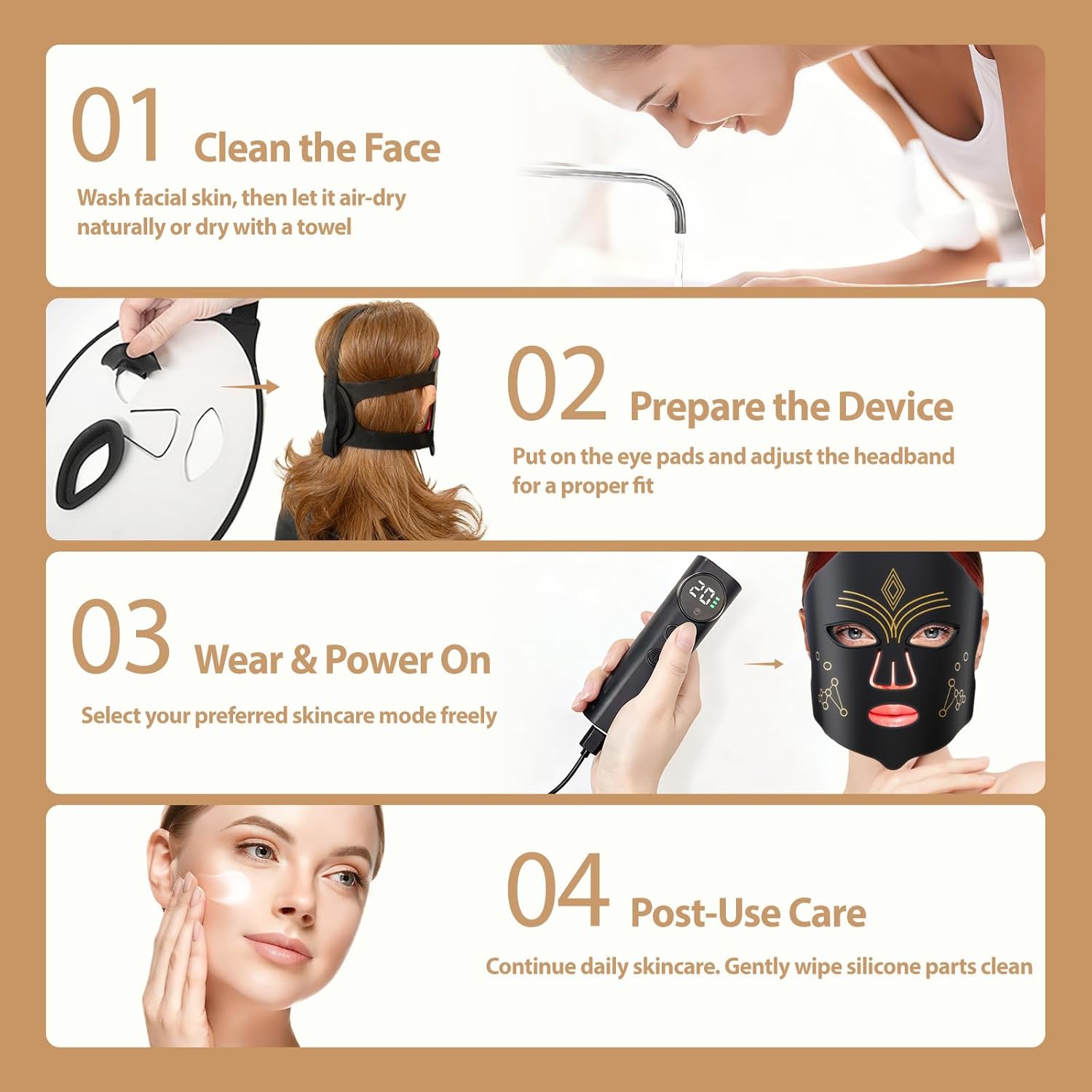 Flexible Timer for Custom Use: This red light mask includes 4 timer options (5/10/15/20 minutes) with a 15-minute default, so you can customize your skincare time. Use it while reading, listening to music, or resting—never disrupt your daily schedule.