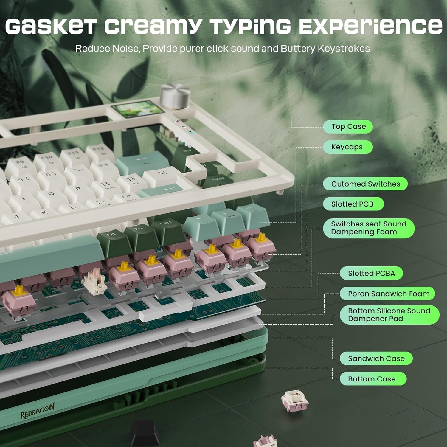 【Gasket Creamy & Silent Typing】Redragon’s signature 5-layer gasket-mounted structure delivers premium sound dampening and buttery keystrokes. Paired with Peach V3 silent axis can effectively reduce the noise generated by typing, creating a quiet environment for users, ideal for offices, libraries, dormitories and other places where quietness is required.