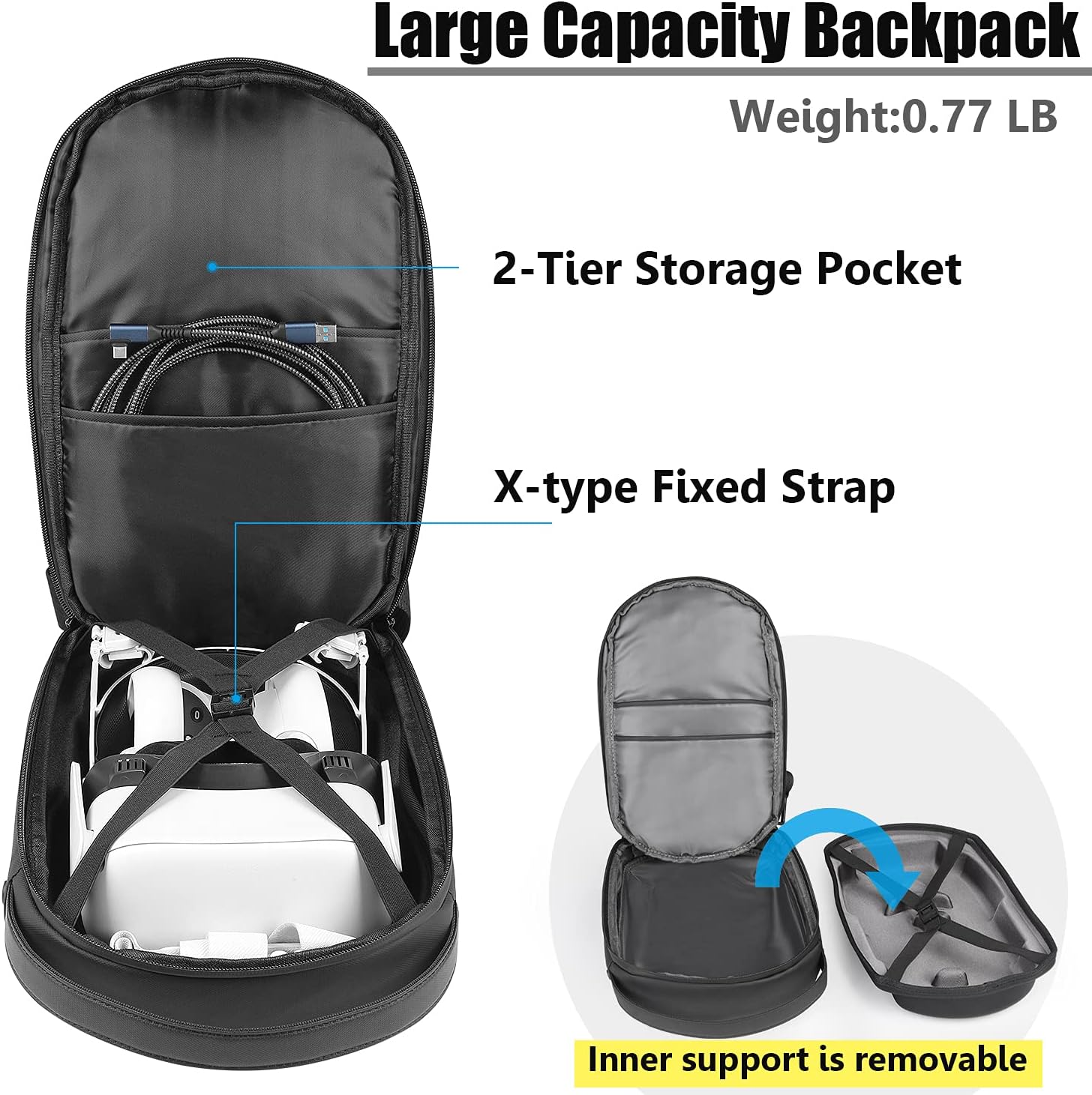 FIT FOR META QUEST 2/3/3S/VISION PRO & ALL SIZE Replaceable straps – Custom designed compartments securely store(Elite Straps, Kiwi Design/BOBOVR Elite Battery Strap) VR Headset (with visible console access). Meanwhile, if your VR device is equipped with any head strap, it can fit easily inside, effectively protecting your device.