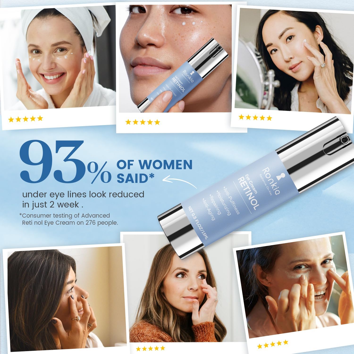 Non-Irritating Formula: While Retinol can sometimes cause irritation, Ronkie Retinol Eye Cream is formulated with soothing ingredients to minimize potential side effects such as redness, peeling, and dryness.