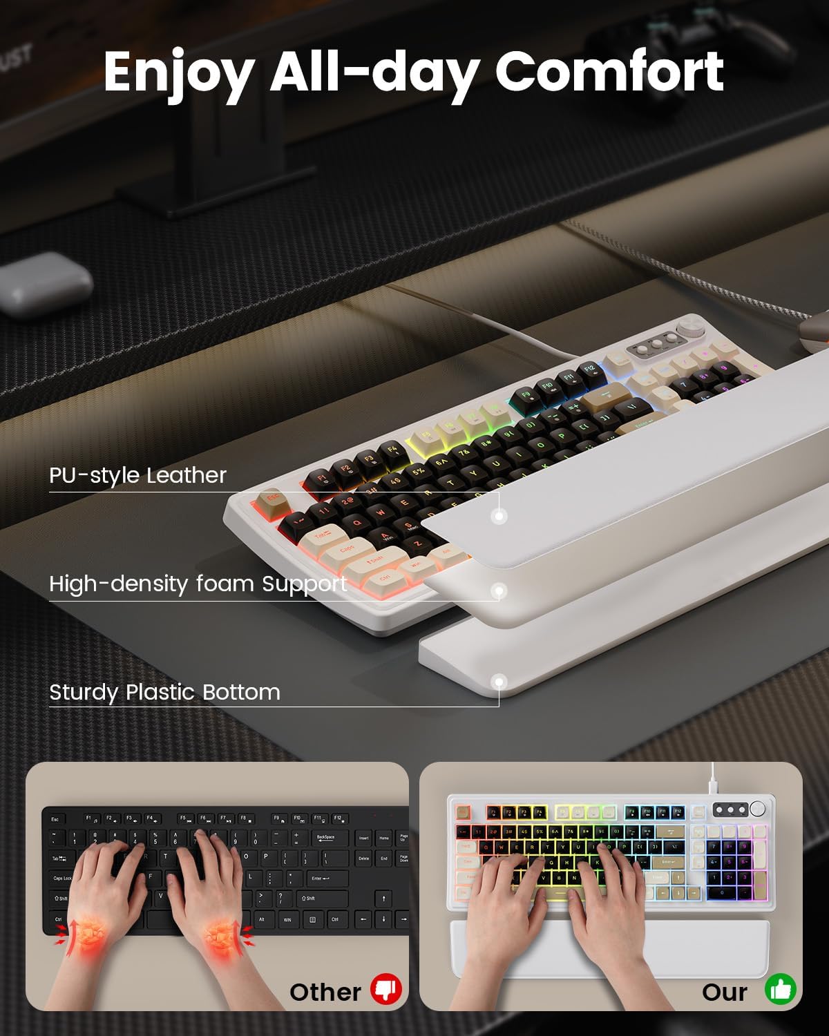 【Leather Wrist Rest & Ergonomic Design】Experience unparalleled comfort during marathon gaming sessions or extended workdays with our complete gaming keyboard and mouse set. The soft, anti-slip PU leather wrist rest reduces wrist fatigue by 30%, while curved keycaps follow natural finger contours for gamers and office workers