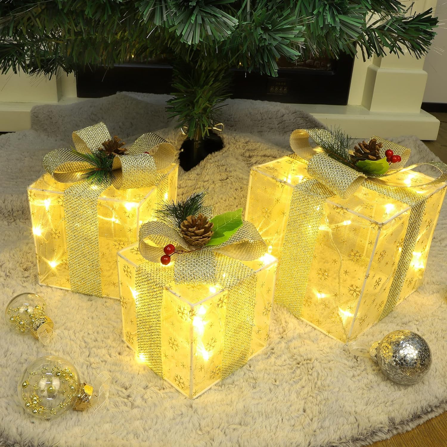 Adorable Lighted Christmas Gift Boxes: Decorate your space with our set of 3 lighted Xmas organza present boxes dotted with snowflakes in the coming up Christmas. Comes with super bright 60 LED warm white lights, it is absolutely a beautiful scenery to stack the gift boxes, or place them side by side under the Christmas tree or front porch