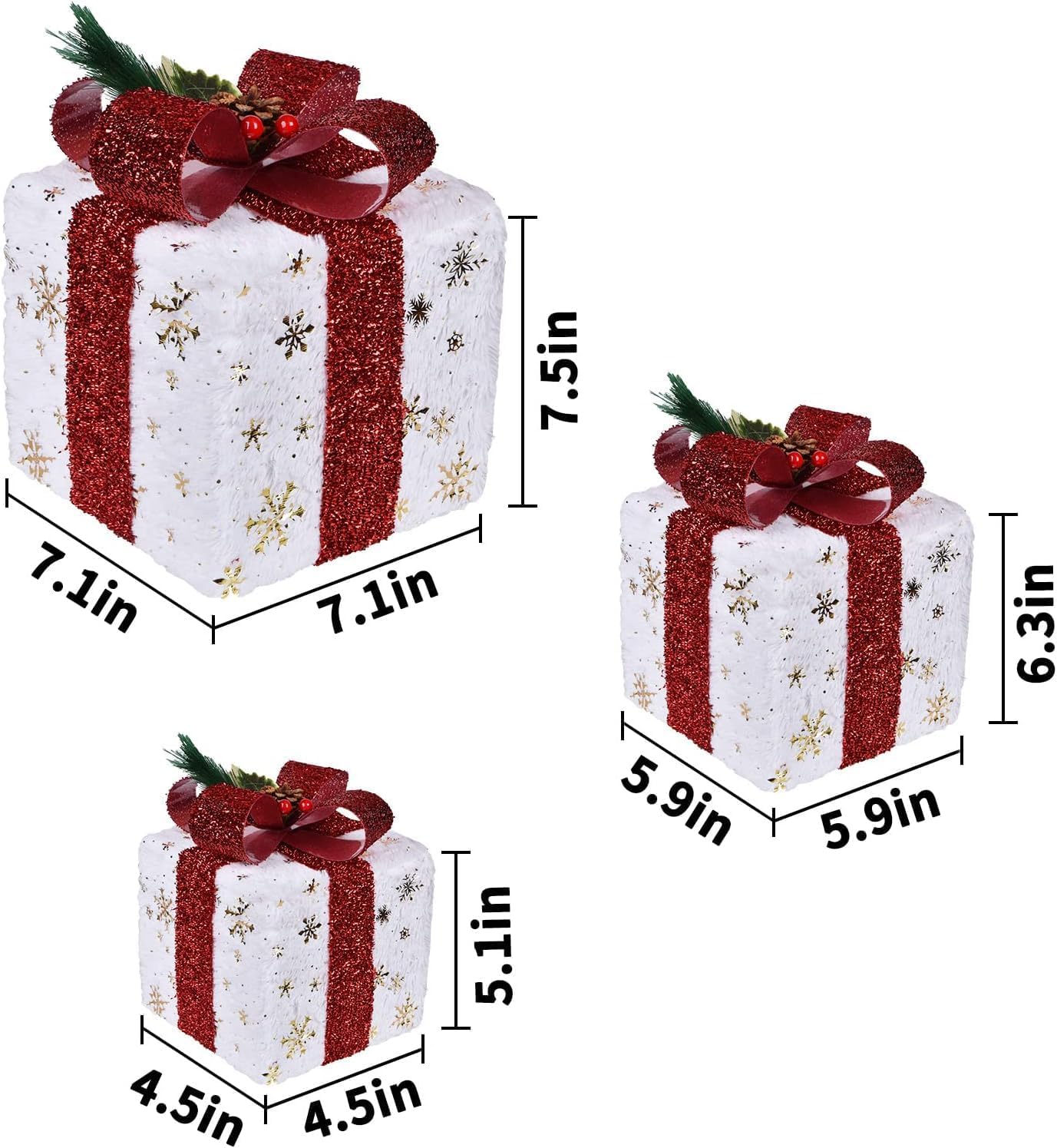 Dimensions: There are 3 different size of Christmas gift boxes, the large size is 7.5″ x7.5″ x7.2″, medium size is 6.3″ x6.3″ x6.1″, small size is 5.1″ x5.1″ x4.9″