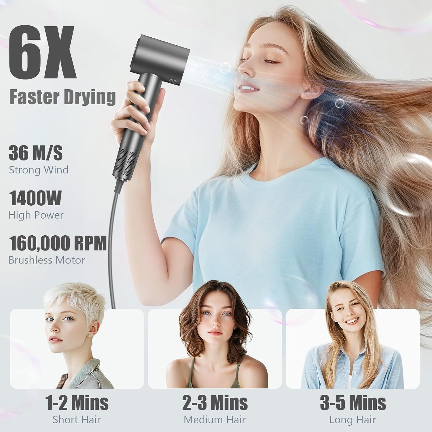 【110,000 RPM For The Fastest Dry imaginable】Leave standard dryers in the past. With a powerful 110,000 RPM brushless motor, our salon-grade airflow dries thick, long hair in about 5 minutes and short hair in just 60-90 seconds. Reclaim your time for busy mornings, pre-workout routines, or last-minute events.