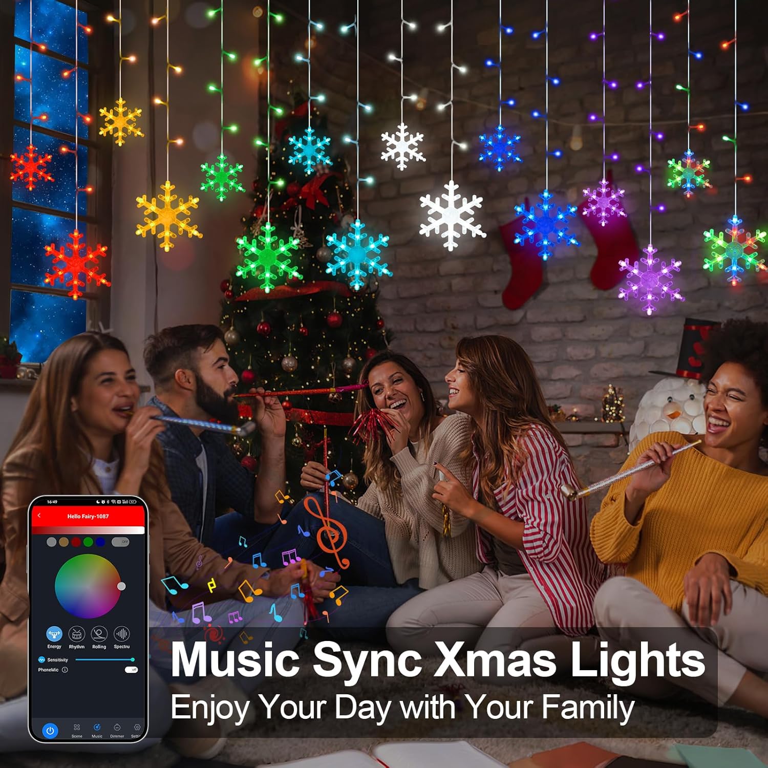 【Smart Christmas Snowflake Lights】This 16.4FT string lights features 16 snowflake drops with 192 LEDs. Each LED is designed with an IC chip, allowing you to program the colors via our smart app to create your favorite lighting effects.