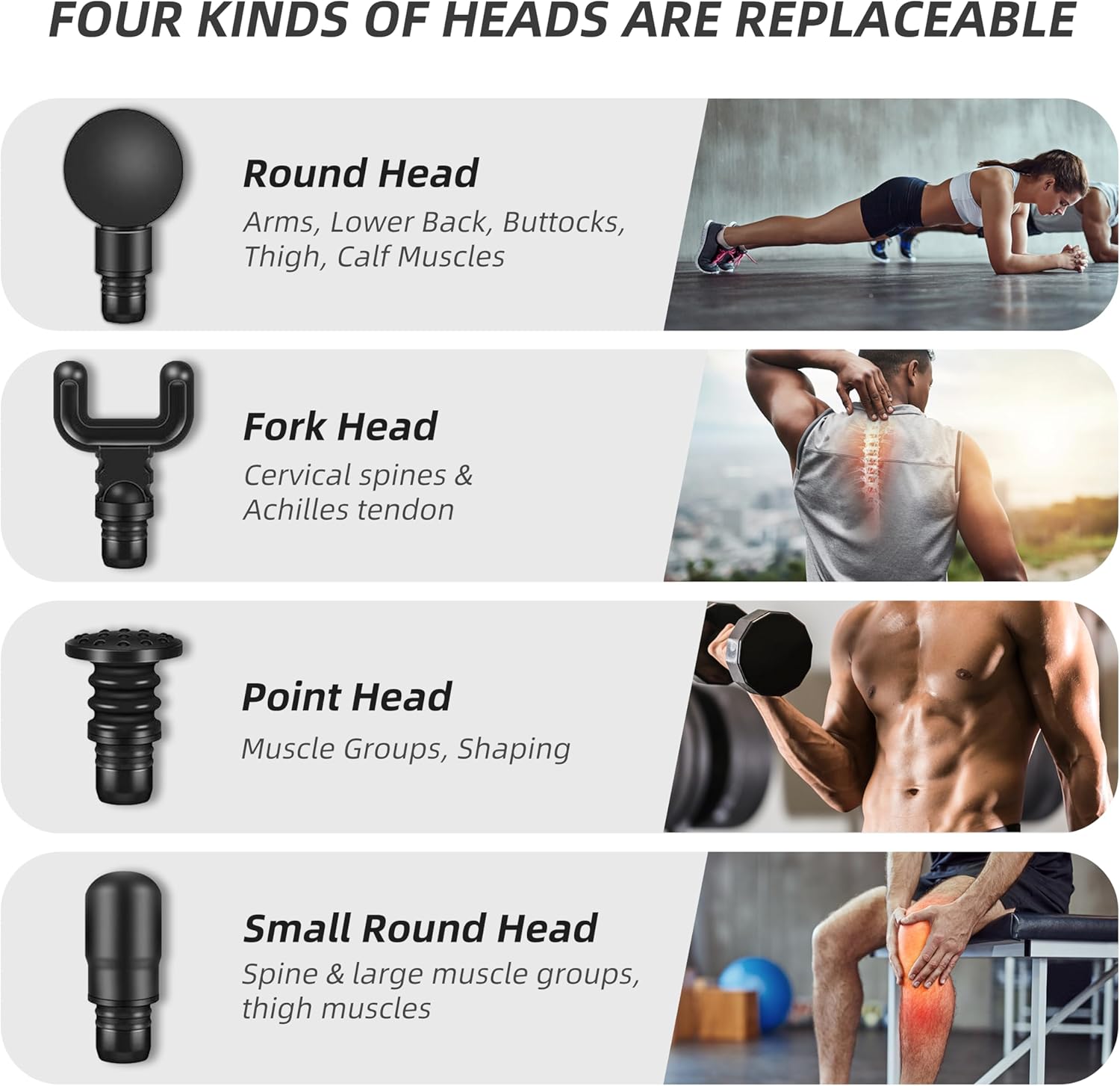 Speed Levels: It truly feels like your muscles are being comfort by a professional massage. The massage gun features 4 massage heads and 5 levels of intensities, which allow you change the massage head and change the speed to precisely massage different body parts as needed.