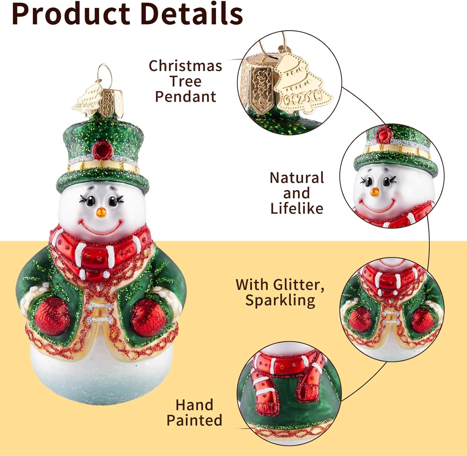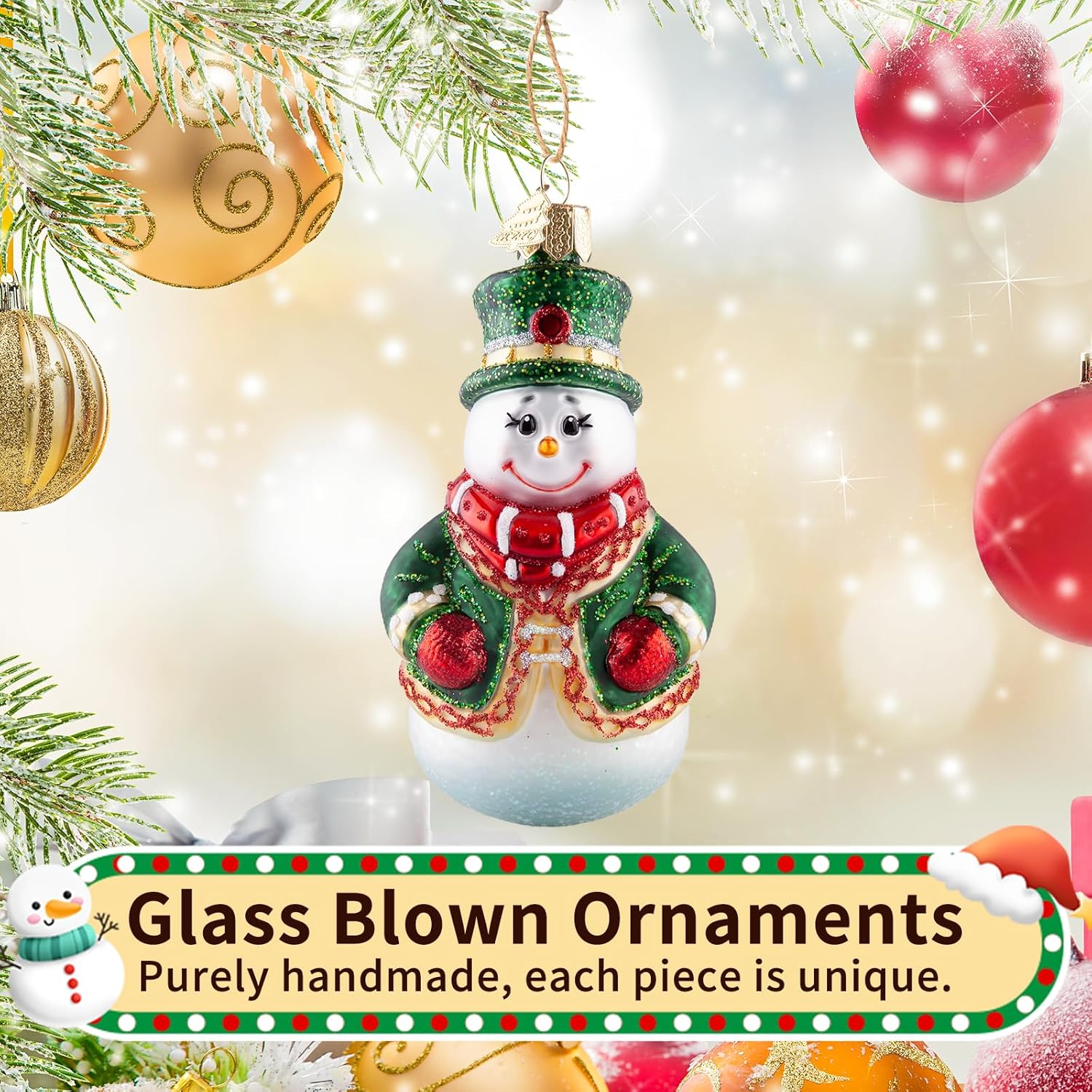 Traditional Hand-Blown Glass: The Christmas ornaments originated from traditional art in the 19th century, where molten glass is blown into exquisitely carved molds and intricate details are hand drawn by skilled craftsmen. Every snowman is unique, making it a valuable and unique creative artwork