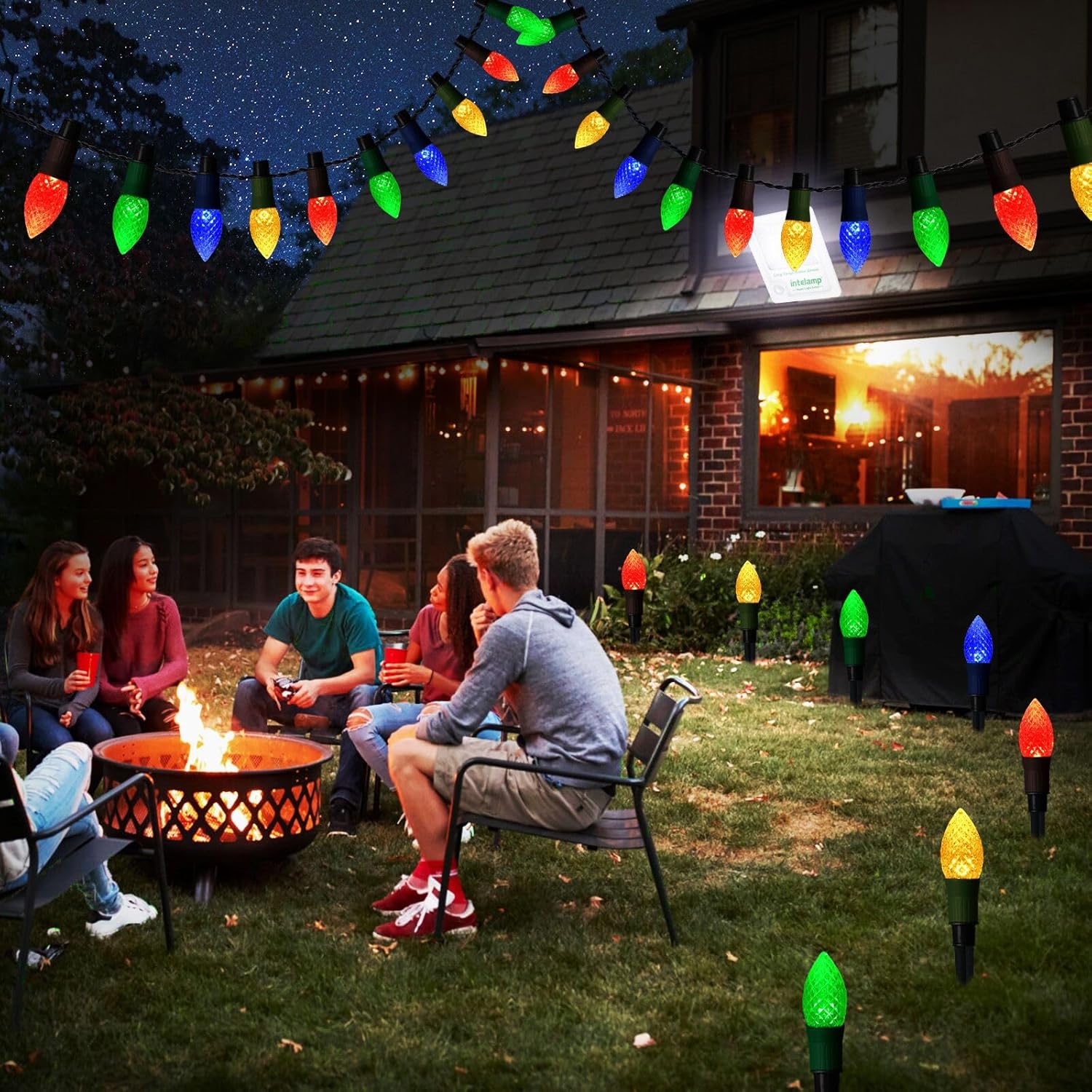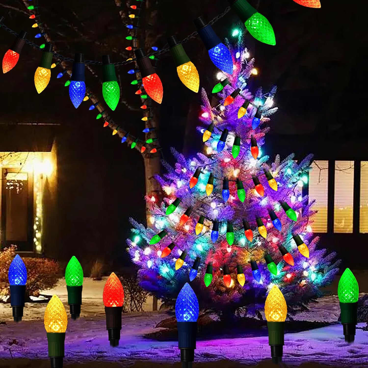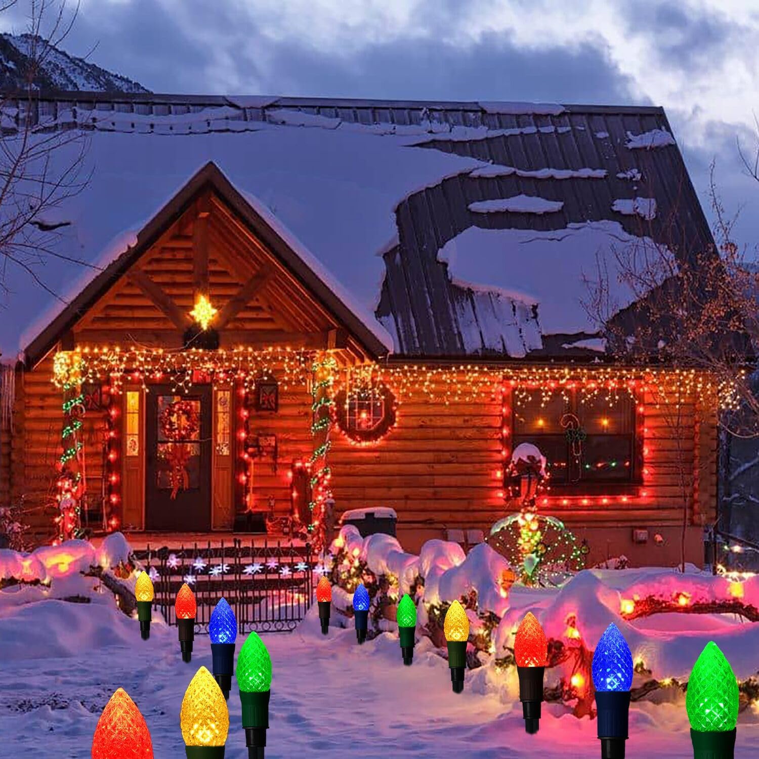 20 LED C9 Christmas Lights Outdoor: 23 feet C9 Christmas pathway lights with 20 C9 strawberry bulbs. 10.3 inches light spacing, 20 sturdy stakes, multicolor(red, green, blue, yellow) lighting effect. This Christmas lights for the sidewalk will be great for your pathway, garden, courtyard, outside Christmas decorations. It is also an exquisite gift for friends, families or relatives.