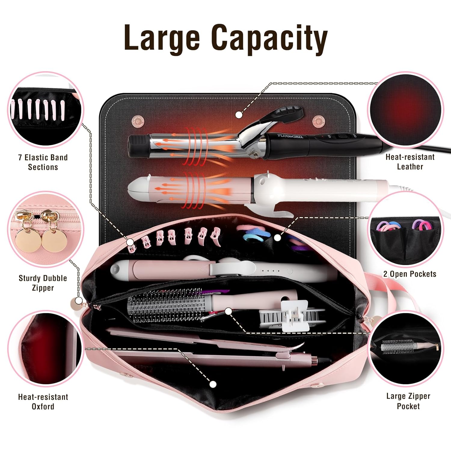 INNOVATIVE DESIGN FOR EXTRA LARGE CAPACITY: This hair tools storage bag boasts an innovative malleable rectangular design with extra-large zipper pocket, ensuring easy access. With two open pockets and six elastic band sections, it provides abundant space to accommodate all your hair essentials like curling iron, hair brush, comb, clips together.