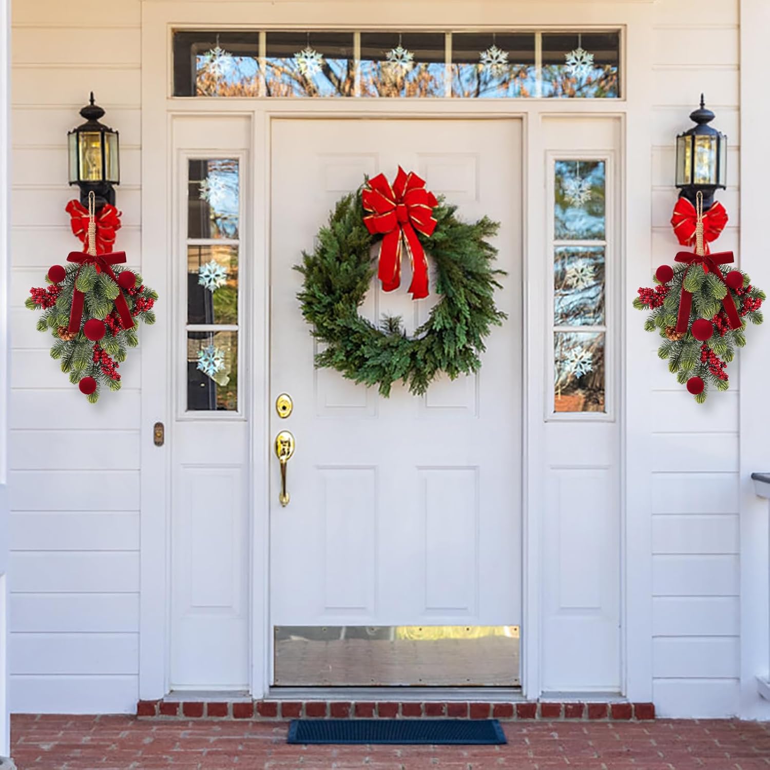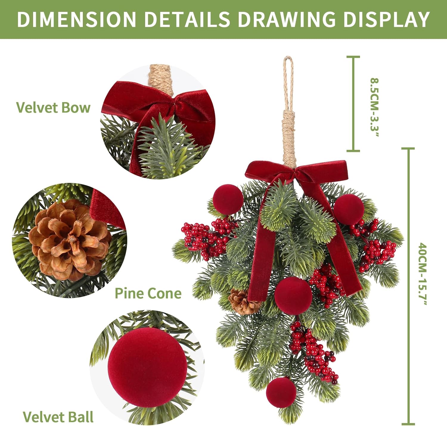 EXQUISITE DESIGN: The set includes 2 Christmas hanging decorations made of artificial green plants, paired with small bow, velvet ball ornaments, plump berry, and pine cone. They created a rich festive atmosphere together, emitting the joy of Christmas.
