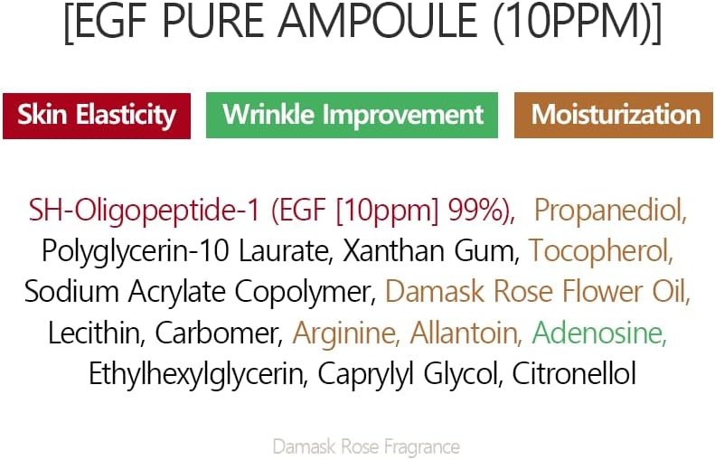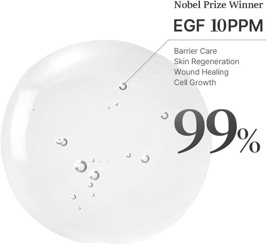 NOBEL PRIZE INGREDIENT: EGF is an amazing ingredient that was awarded the Nobel Prize for its significance in cell growth and wound healing.Using the maximum amount possible, EGF 10 PPM, promotes skin cell regeneration and is a potent and effective anti-aging ampoule.