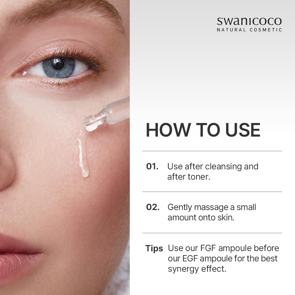 Our skin’s healing ability decreases as we grow older due to a decrease in EGF. EGF is essential to us as it promotes skin regeneration. Swanicoco’s EGF 10ppm, 99% Pure Ampoule is a lightweight ampoule that contains EGF along with other rejuvenating ingredients to strengthen the skin barrier, enhance skin elasticity and protect the skin. It is non-sticky and fast absorbing formula that activates epidermal repair in skin, enhance hydration and helps skin to maintain an optimal water-to-oil balance. This ampoule is best paired with FGF Pure Ampoule (improves dermal density & elasticity) for a whole rounded anti aging solution for skin.