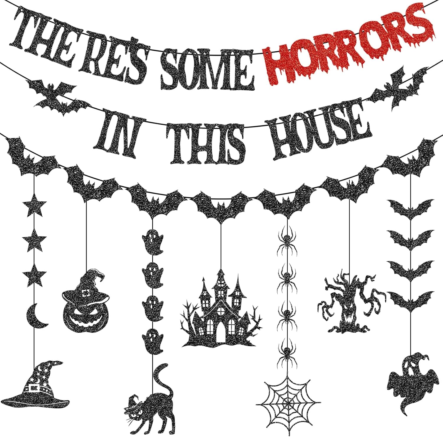 Package Contents: You will get 1 glitter “There’s Some Horrors in This House” banner, 1 bat-shaped banner, and 7 hanging garlands featuring spooky Halloween motifs like spiders, bats, cobwebs, and ghosts—the ideal set for creating a spooky party atmosphere