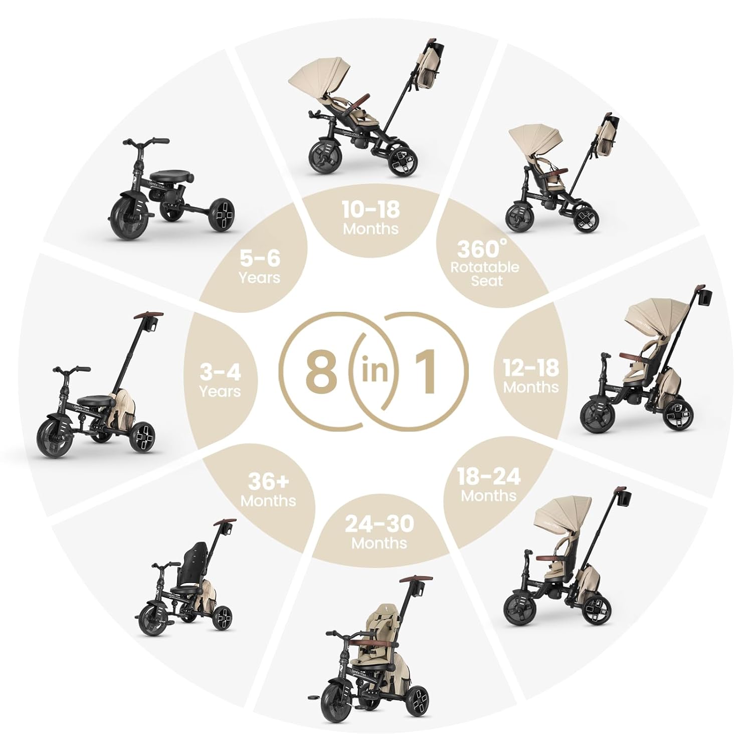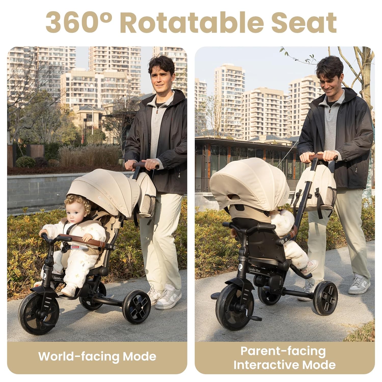 8 in 1 Toddler Stroller Bike: Suitable for babies 10 months to 6 years, this stroller offers multiple adjustable modes—Infant Stroller, sunshade tricycle, parent steering push, Independent riding, Assisted riding, and Foldable portable.