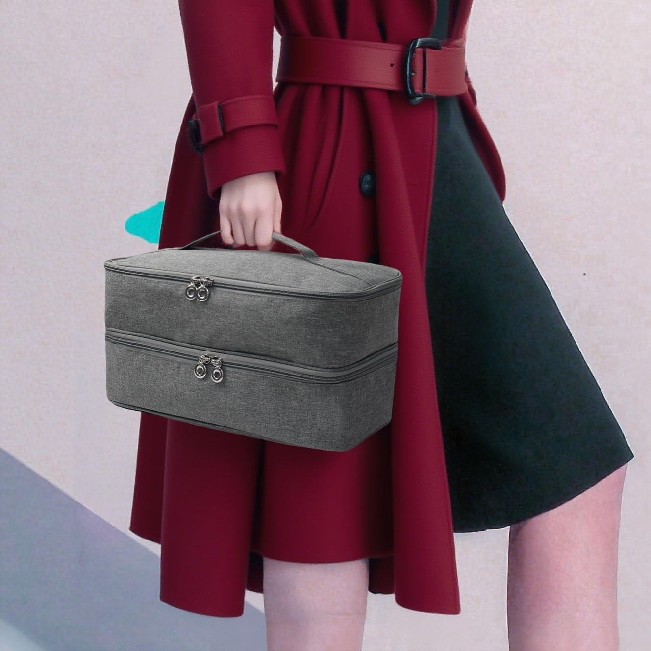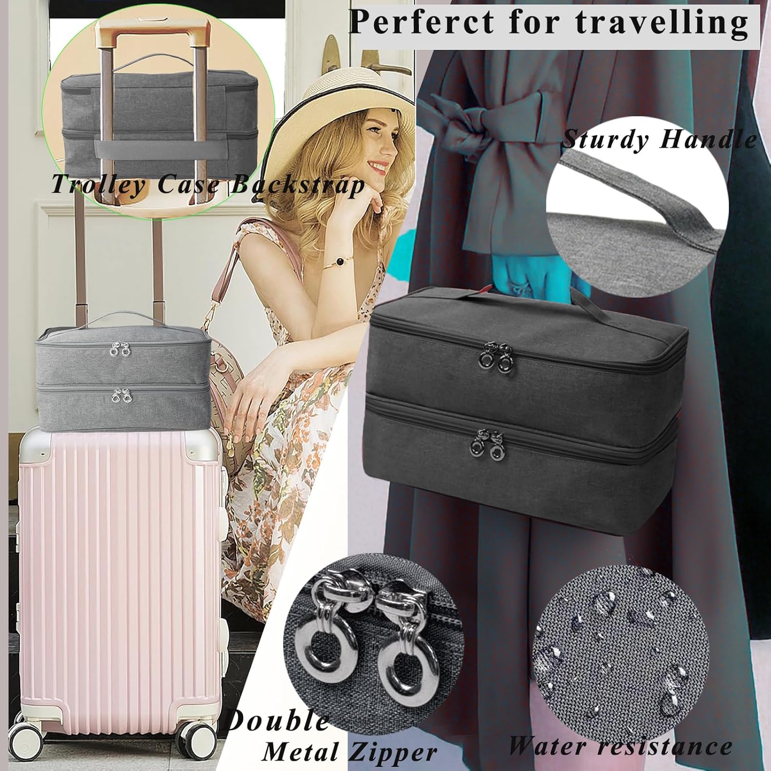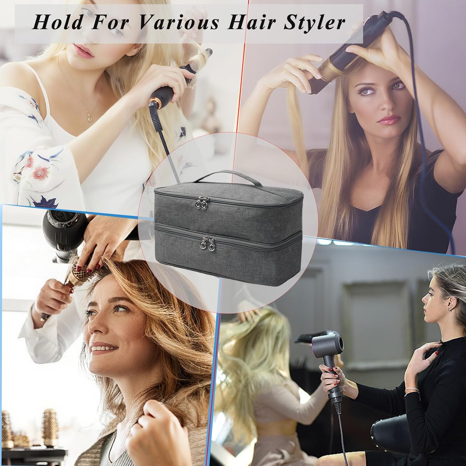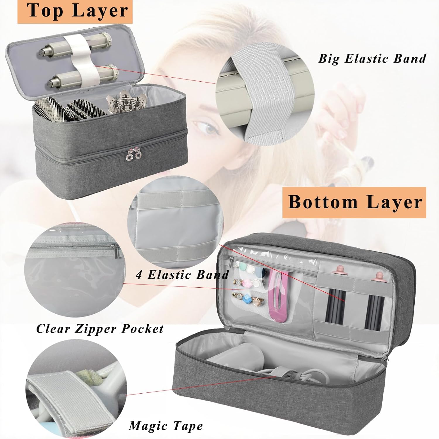 Double Layer Design: : The Storage bag features two separate compartments for organized storage of hair dryer and stylers accessorie :Top Layer separating the hair styling tools body and two extra elastc band for holding small parts, Bottom Layer designed with 1 transparent zipper pocket to hold hair ornaments and 4 elastic fixing straps to secure all accessories in place