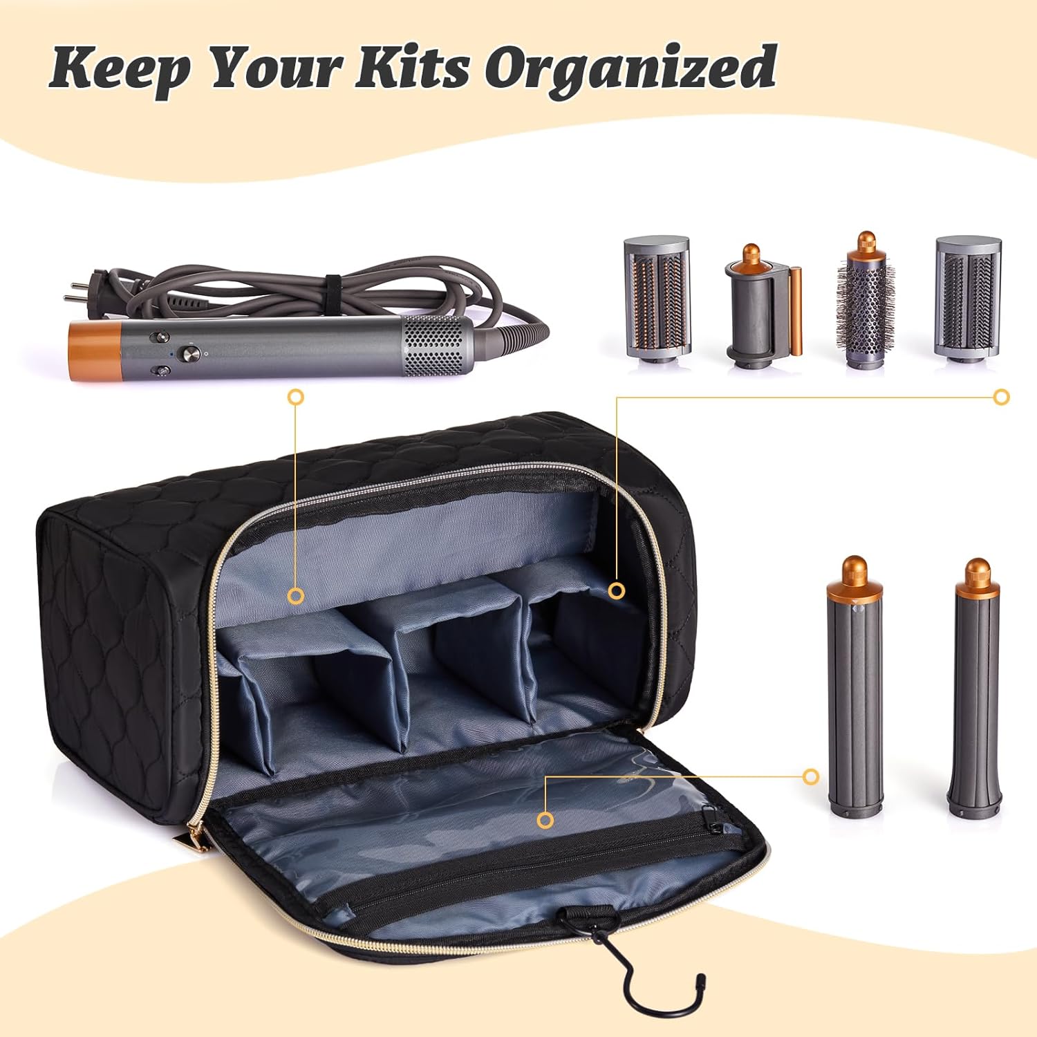 Organized Storage Design – Features 4 individual padded slots to secure short barrels, brushes, and the pre-styling dryer. An extra divider flap separates the main styler and cable, preventing friction and keeping everything in place.
