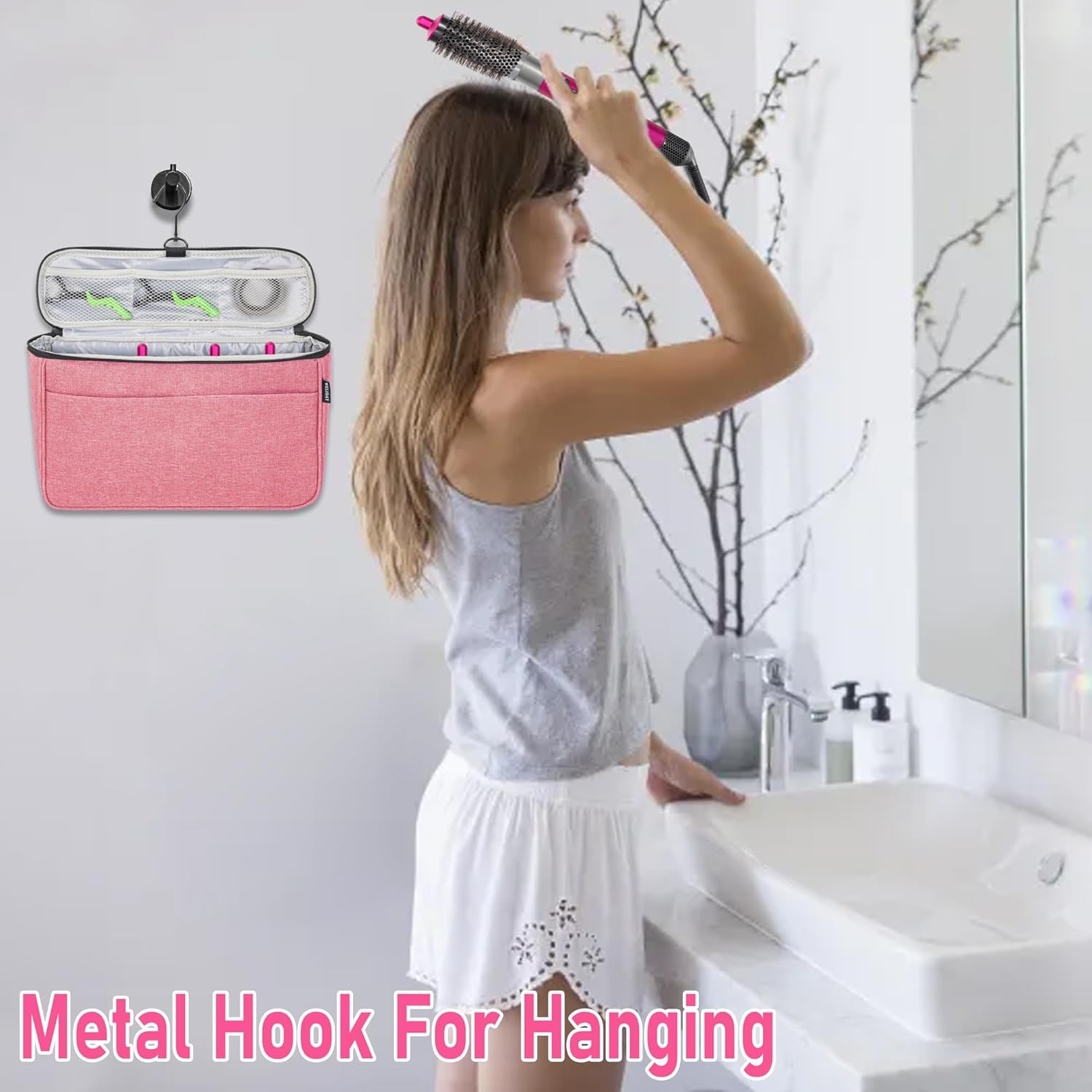 Compatible with Airwrap Styler and other hair curling device360-degree swivel hook and three storage mesh bagsTwo storage compartments in the front and one storage compartment in the back