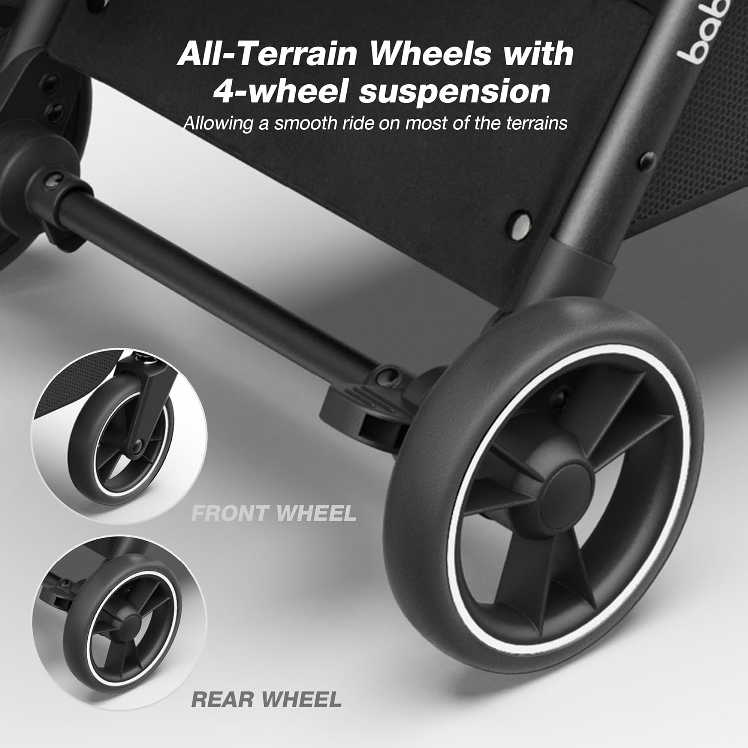 Strong Frame & Durable Wheels: The frame adopted AeroSpace-Grade material which can provide a range of benefits that make the stroller strong without wobbling, it’s durable,and safe for parents and their children to use,It also featured a foot-operated linked-brake for quick stops, adjustable 5-point harness, and EVA shock-absorbing tires with all-4-wheel suspension – Together they are providing with a smooth ride for you and your baby.