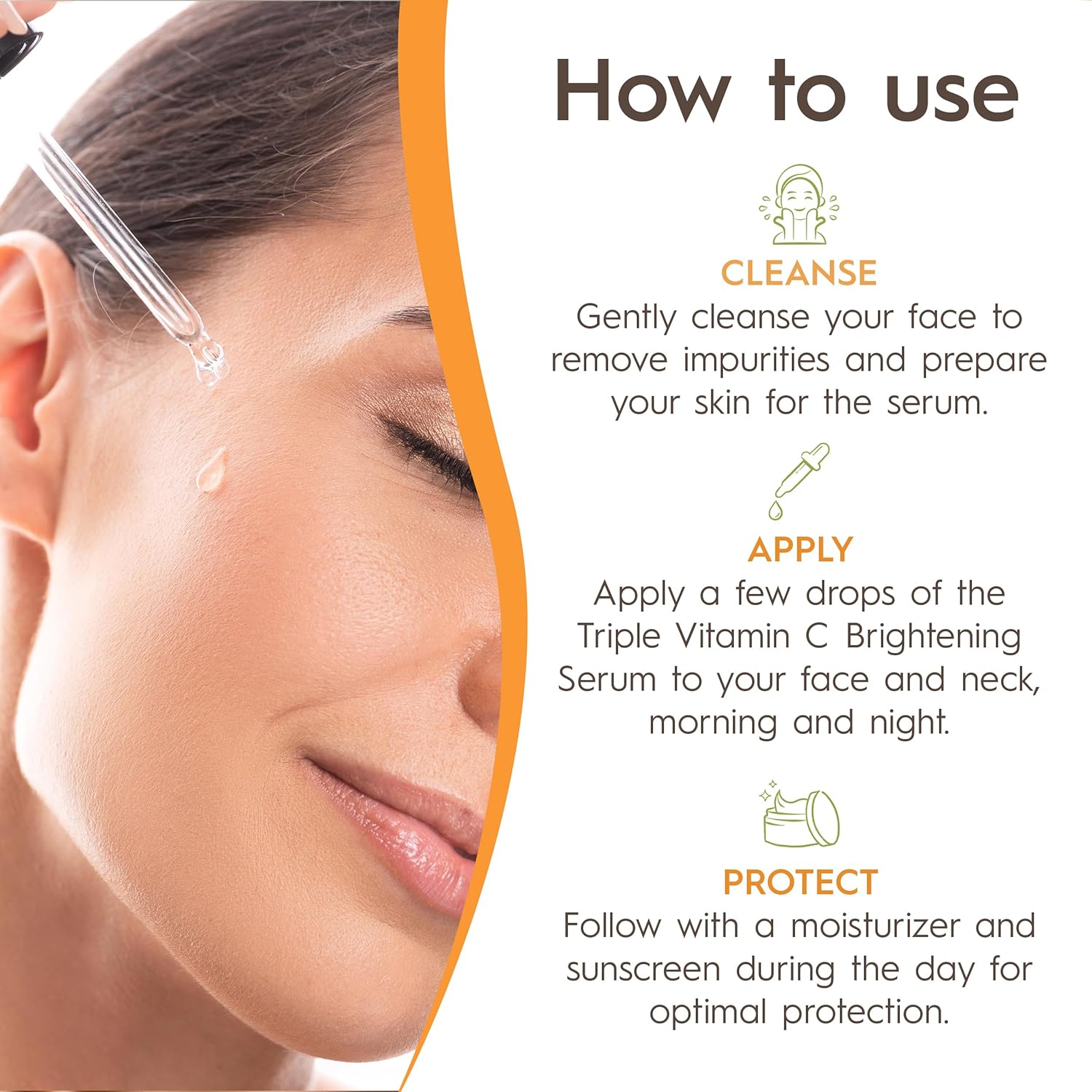 GLOW WITH CONFIDENCE: Reveal your skin’s natural radiance with our triple-action Vitamin C serum. Experience a smoother, more even complexion that looks vibrant and youthful every day.