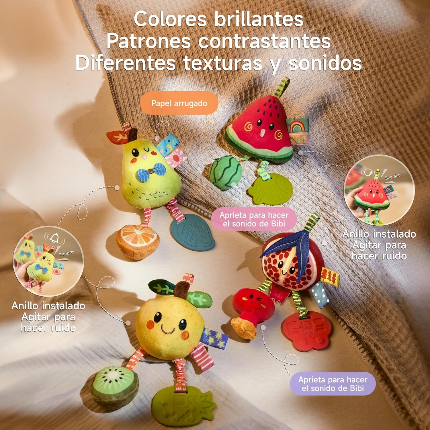 ENHANCED INTERACTION: Engage and bond with your baby using this hanging rattle toy. Cheerful fruit toys (pear, watermelon,Lemon, pomegranate) that jingle, crinkle, or “bi-bi” when touched. Perfect for shared giggles or solo play—easily attach to play gyms or strollers. Durable, lightweight, and designed to nurture curiosity while giving caregivers flexibility.