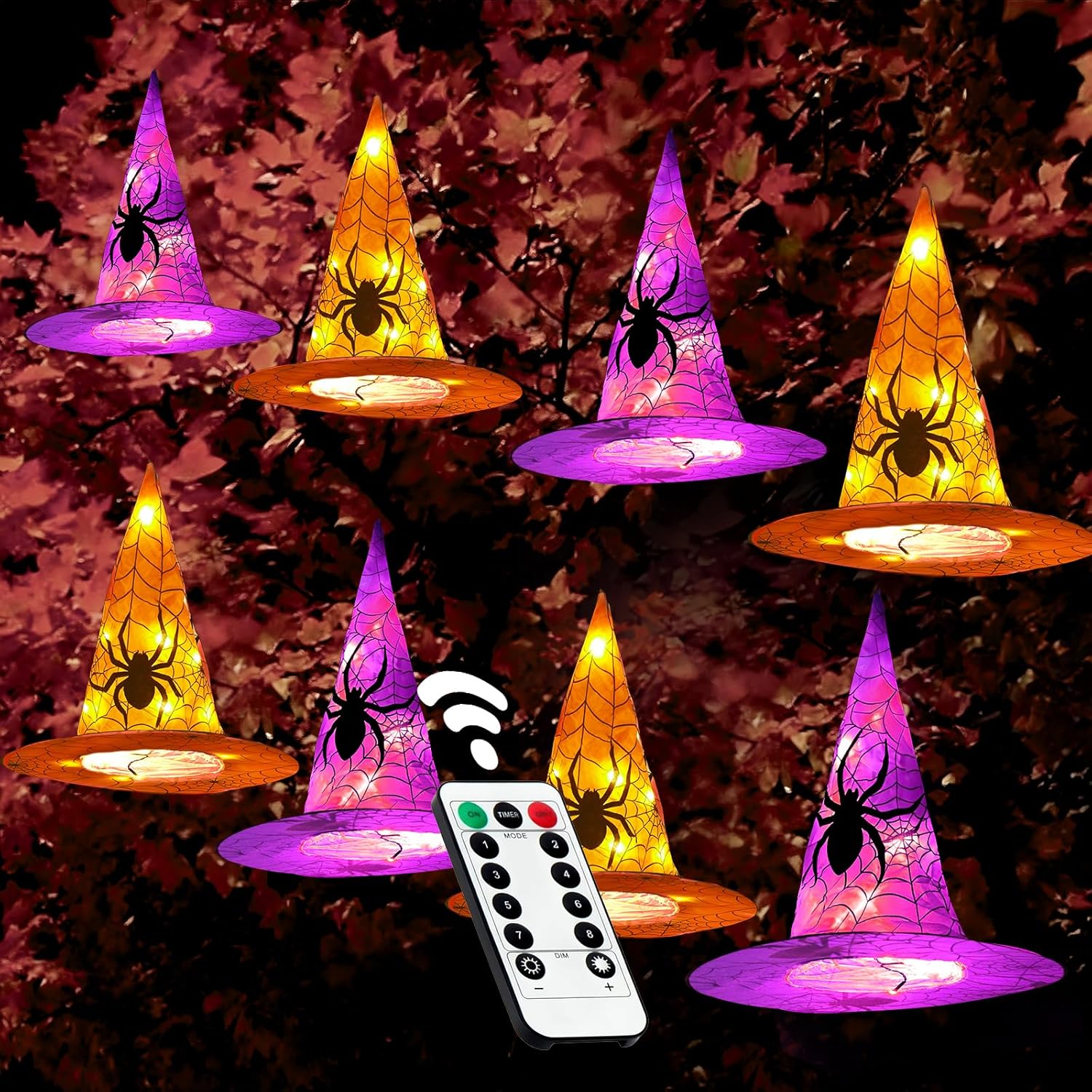 PERFECT HALLOWEEN OUTDOOR DECORATION: The perfect combination of halloween witch hats with warm white string lights make you feel like you are in a mysterious castle of terror. There are 8 pcs witch hats (4 orange,4 purple)on string lights, each hat have 7 LEDs inside. Length: 14ft. Total length: 16ft.