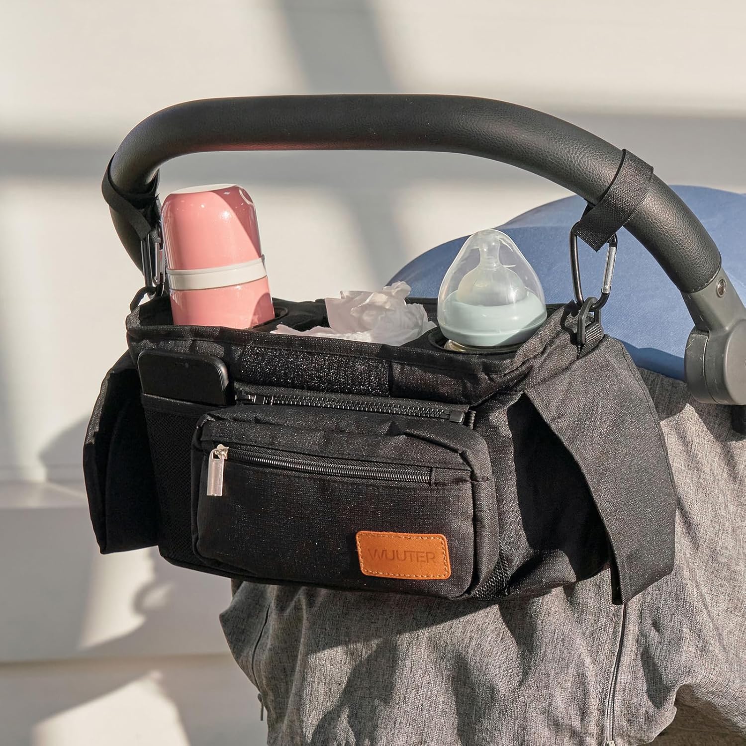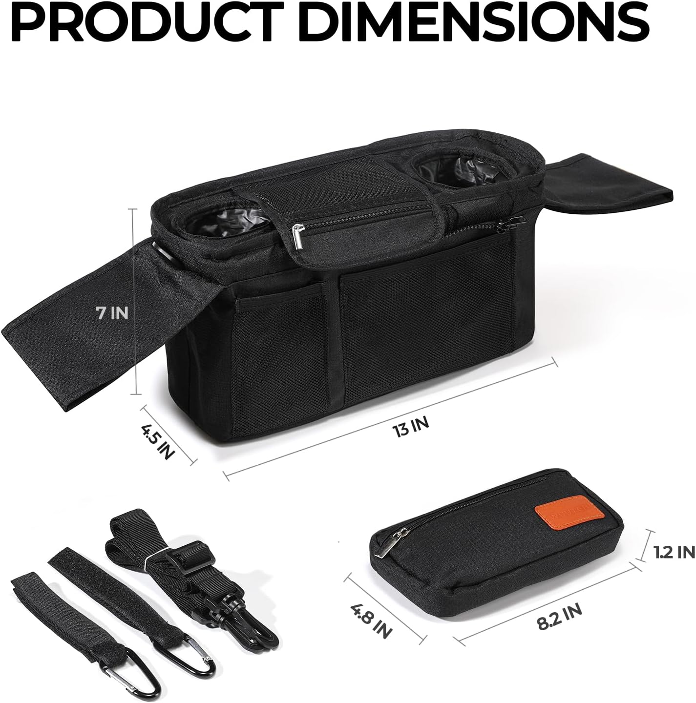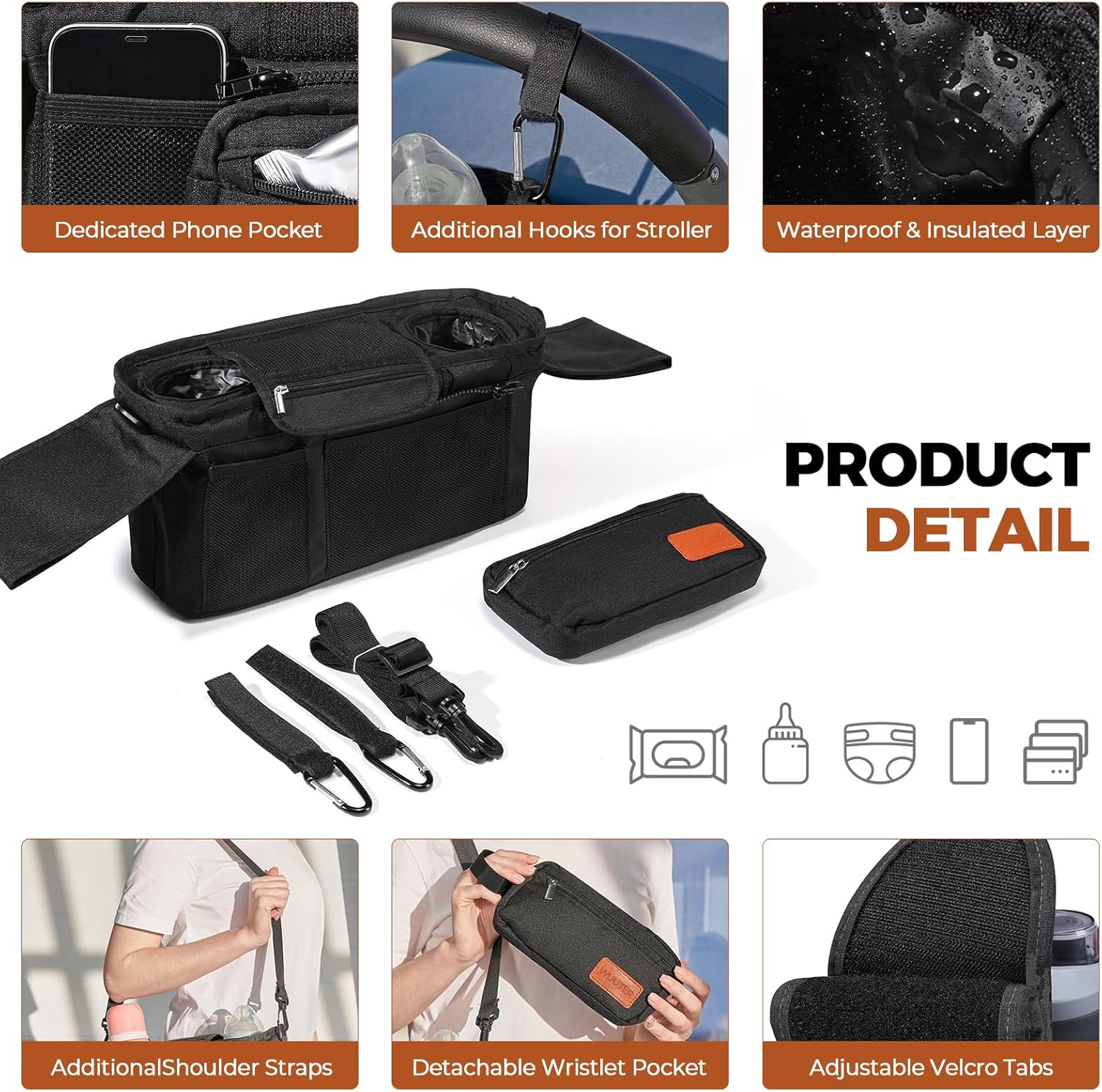Universal Stroller Organizer with Insulated Cup Holder & Detachable Wristlet Large Capacity Baby Stroller Bag Organizer for Mom, Baby Jogger, Uppababy, Britax, BOB, Umbrella & Pet Strollers(Black)