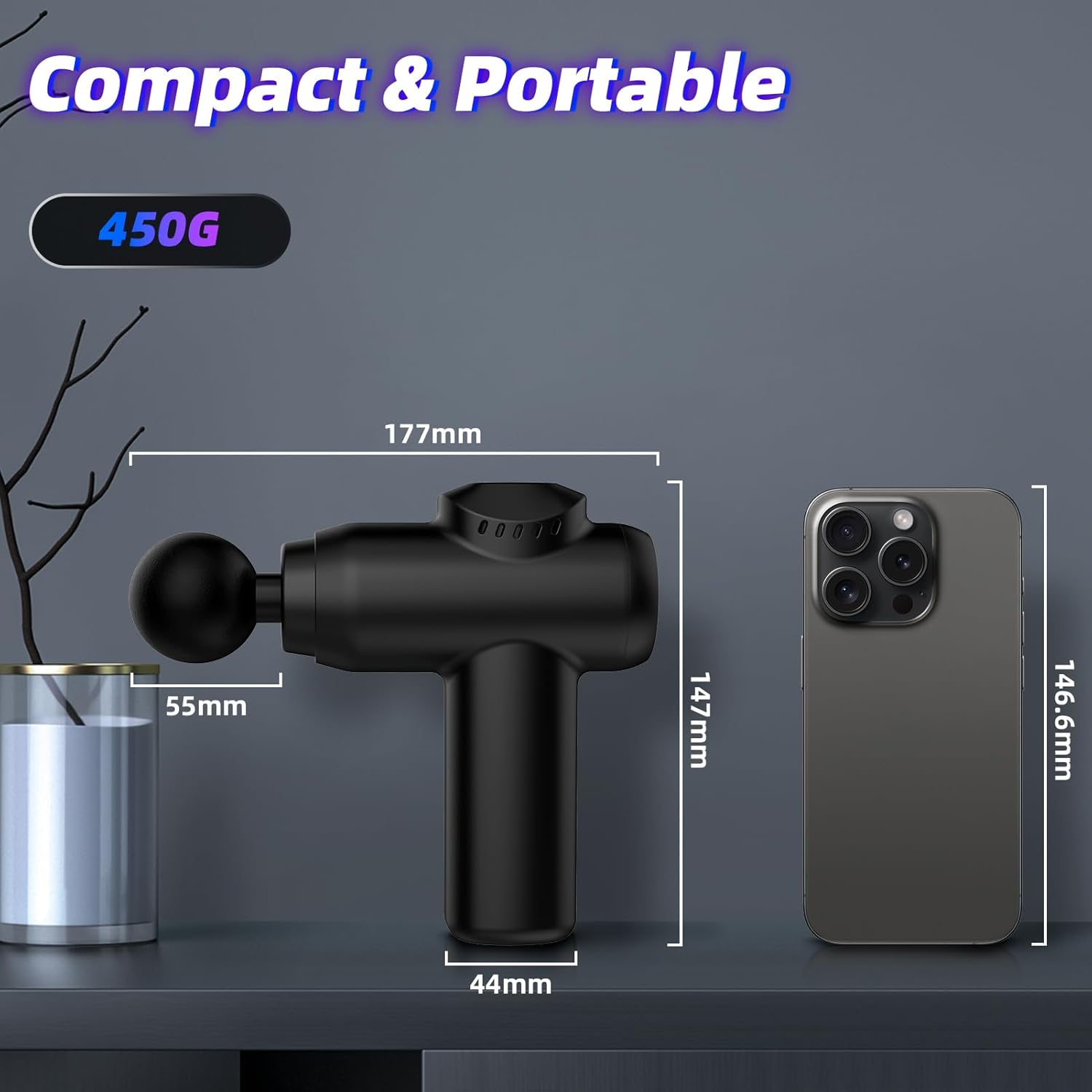 【COMPACT&LIGHTWEIGHT】This small massage gun features a light weight (450g) and small size that won’t leave your hands sore after long hours of gripping. Easy to carry and compact, so our mini gun a massage doesn’t add too much weight to your bag when you’re out exercising, such as going to the gym.