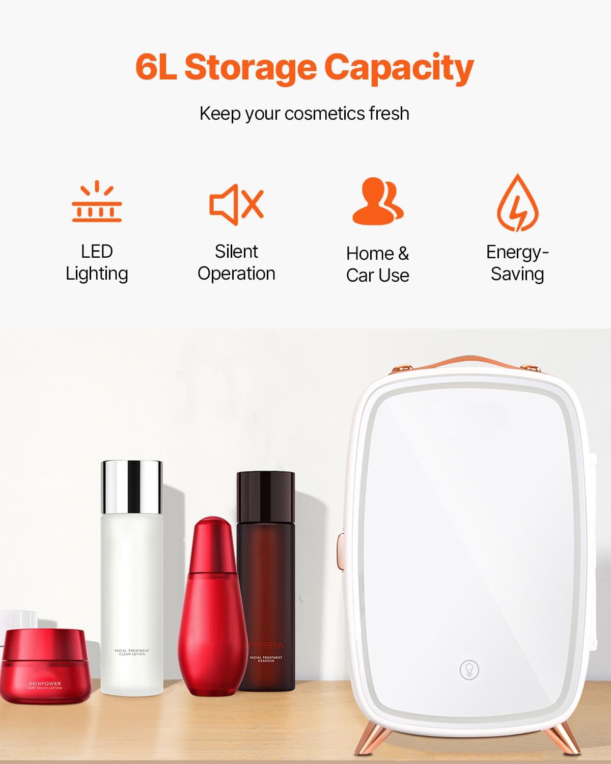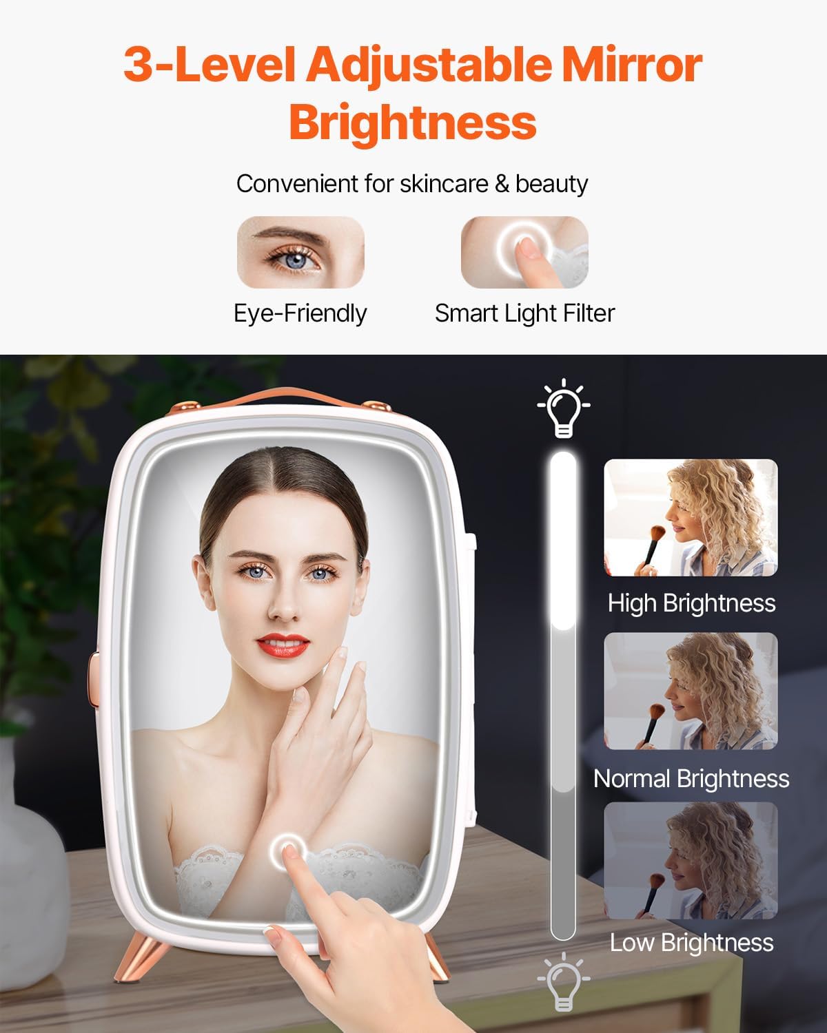 Beauty-Focused Design: Equipped with a high-definition makeup mirror and 3-level adjustable LED lights, this makeup fridge provides ideal lighting for flawless touch-ups, combining style and function in one compact unit.