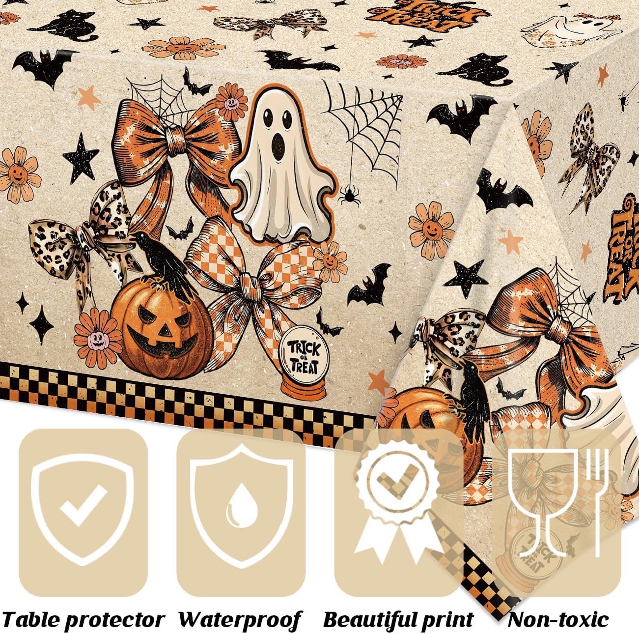 【Stylish Halloween Decor】Our 4-pack Halloween ghost tablecloths showcase playful, spooky-chic patterns—think black cats, eerie ghosts, plump pumpkins, cute bows, spider webs, and “Trick or Treat” wording. Perfect for spicing up indoor/outdoor Halloween decor or party setups, these quirky plastic tablecloths instantly infuse your space with festive vibes. Transform your desk or table into a haunted highlight, making every gathering feel like a hauntingly cheerful Halloween celebration.